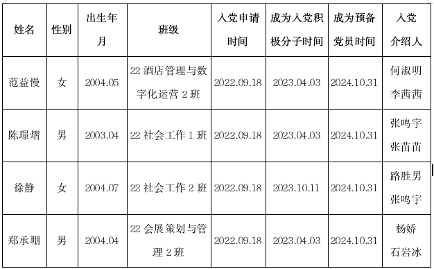 经支委会研究,定于 2024 年 10月 31 日召开党员支部大会,对范益慢等4名发展对象吸收为中共预备党员进行讨论,望广大师生予以监督。如不符合条件,请在公示之日起七天内向本支部或上级党委反映,并提供必要的证据。举报电话: 83803652 。