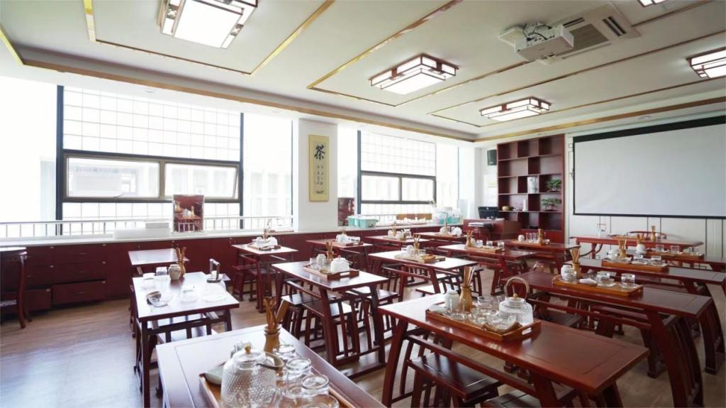 茶文化实训室占地160平方米,配有实木教学桌凳及各种茶具,可满足茶艺、茶叶审评、茶调饮、抹茶道等茶类教学使用,配备有全自动高纯度过滤开水器、空调、高清激光投影、高档多媒体一体机等先进设备,为省茶艺与评茶技能大师工作室分部。