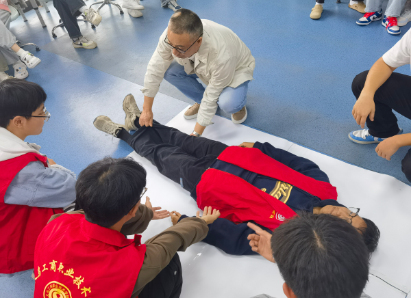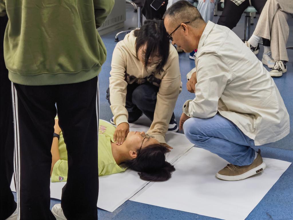 第三个环节是实操部分。同学们以寝室为单位进行分组,分别就应急救护的技巧和方法进行了练习,计院长则在旁边进行手把手指导和纠错。做中学,学中做,同学们在学习了急救知识的同时,更是通过亲身施救中技巧的运用实现了知识的内化于心。