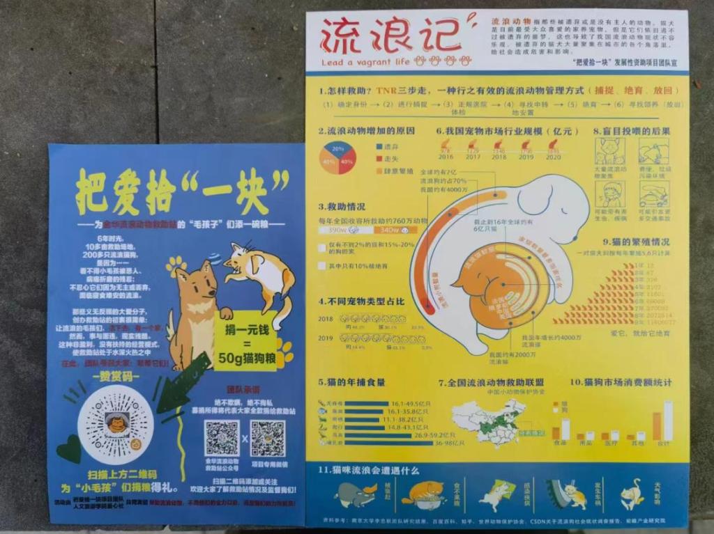 此次活动的最终受益方是金华市流浪动物救助站。几周前,项目团队凭义工的身份已前往救助站进行寻访验证工作,以确保项目真实性,并与其展开了交流合作。本次活动主要以关爱流浪动物的宣传为目的,募捐流浪动物救助金为重点。活动采取了线下设点+传单派发两个形式进行宣传。