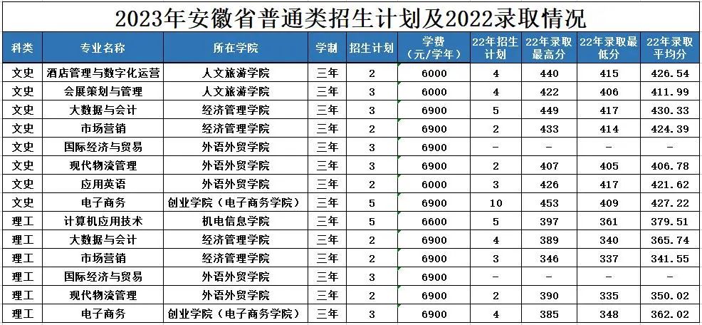 2023年,学校面向全国7省招生4577人,其中安徽省计划40人,安徽省招生计划具体如下: