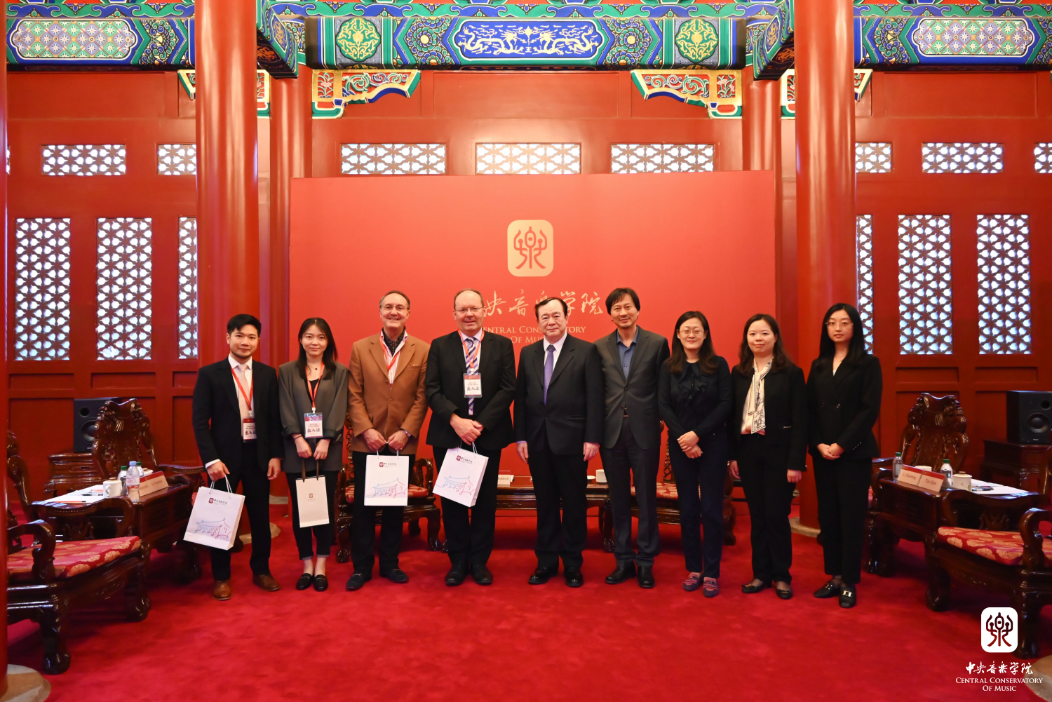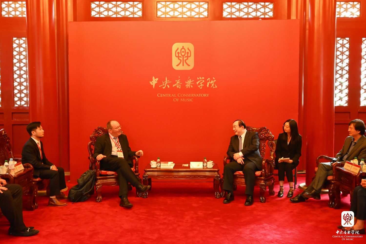 2023年10月13日下午, 校长俞峰在学校王府南大殿与到访的英国皇家伯明翰音乐学院院长斯蒂芬·马多克(Stephen Maddock)亲切会谈,双方就办学情况、教育教学、艺术实践、服务社会等方面进行了细致交流,尤其在音乐人工智能学科发展方面进行了深入探讨。