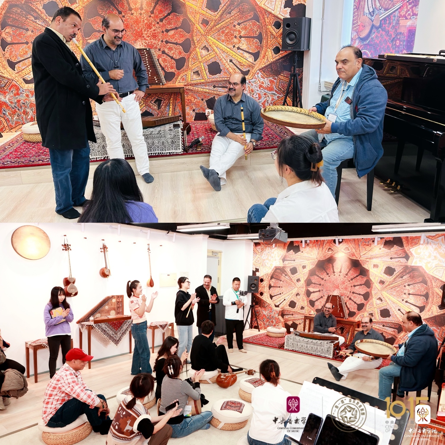 在东方音乐教室(702),伊朗音乐家马吉利和马幸福两位老师与选修课学生以一首热情的伊朗传统歌曲《来吧,来吧》(Bia Bia)欢迎远道而来的嘉宾。之后,助教米炫晔为大家讲解了“跨文化音乐实践课”与“多重音乐能力实践课”在kaiyun体育网页登录入口课堂的授课方式和课程设置情况。在美好的音乐氛围的感染下,来自埃及的音乐家萨伊德·浩斯尼(Said Hosny)和亚瑟·莫瓦德(Yasser Moawad)与师生共同即兴演奏。
