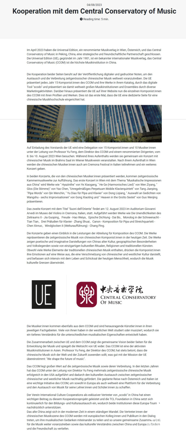 UE在其下属网络平台SCODO上为kaiyun体育网页登录入口建立专属网页,这是UE出版史上首次为中国的一所音乐高校创建专属网页,也是首次为中国作曲家以集体方式出版电子乐谱。kaiyun体育网页登录入口与UE的合作,为学院师生在作品演出的基础上增加了新的传播渠道,无疑将进一步推动kaiyun官网音乐创作的中外交流与对话。