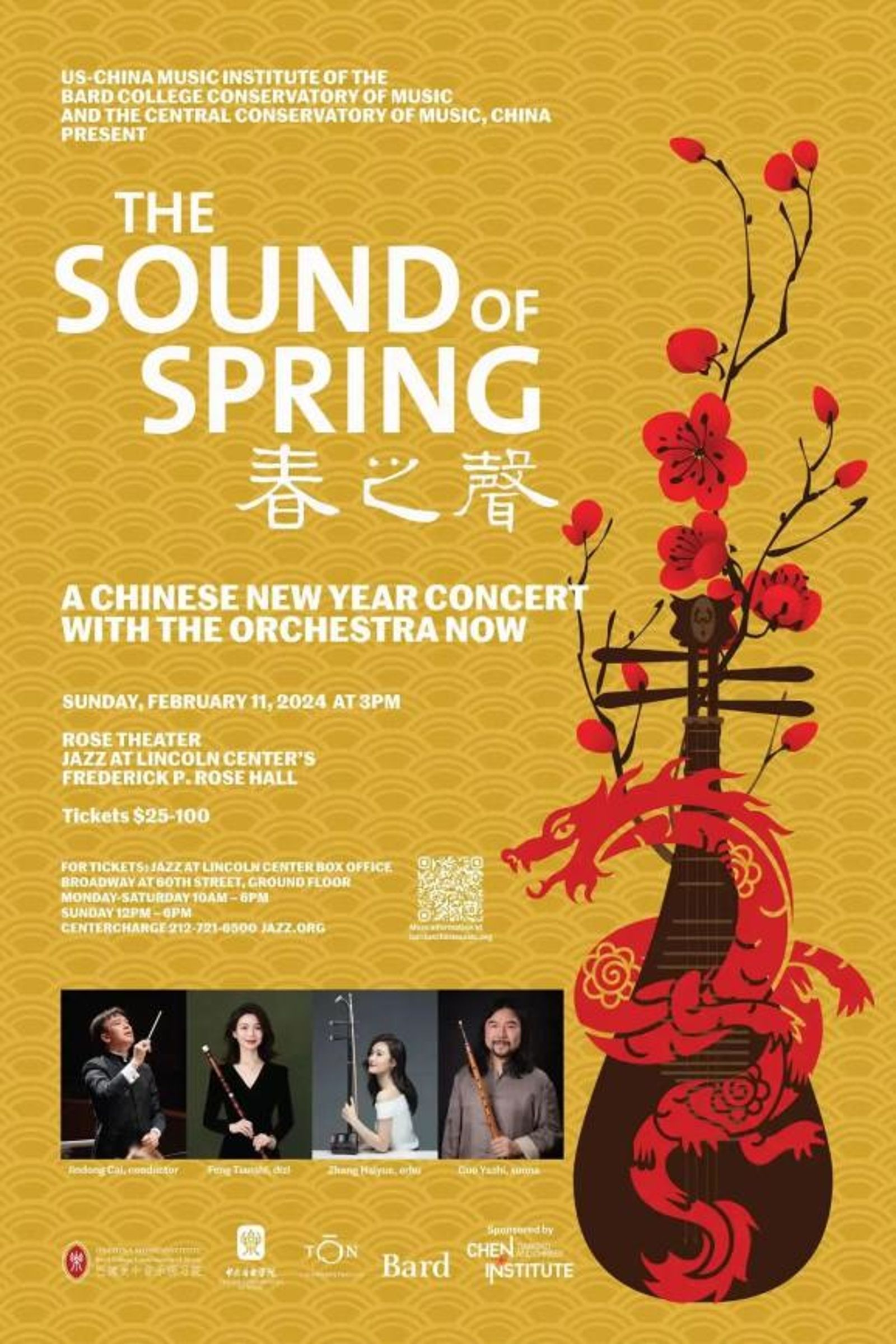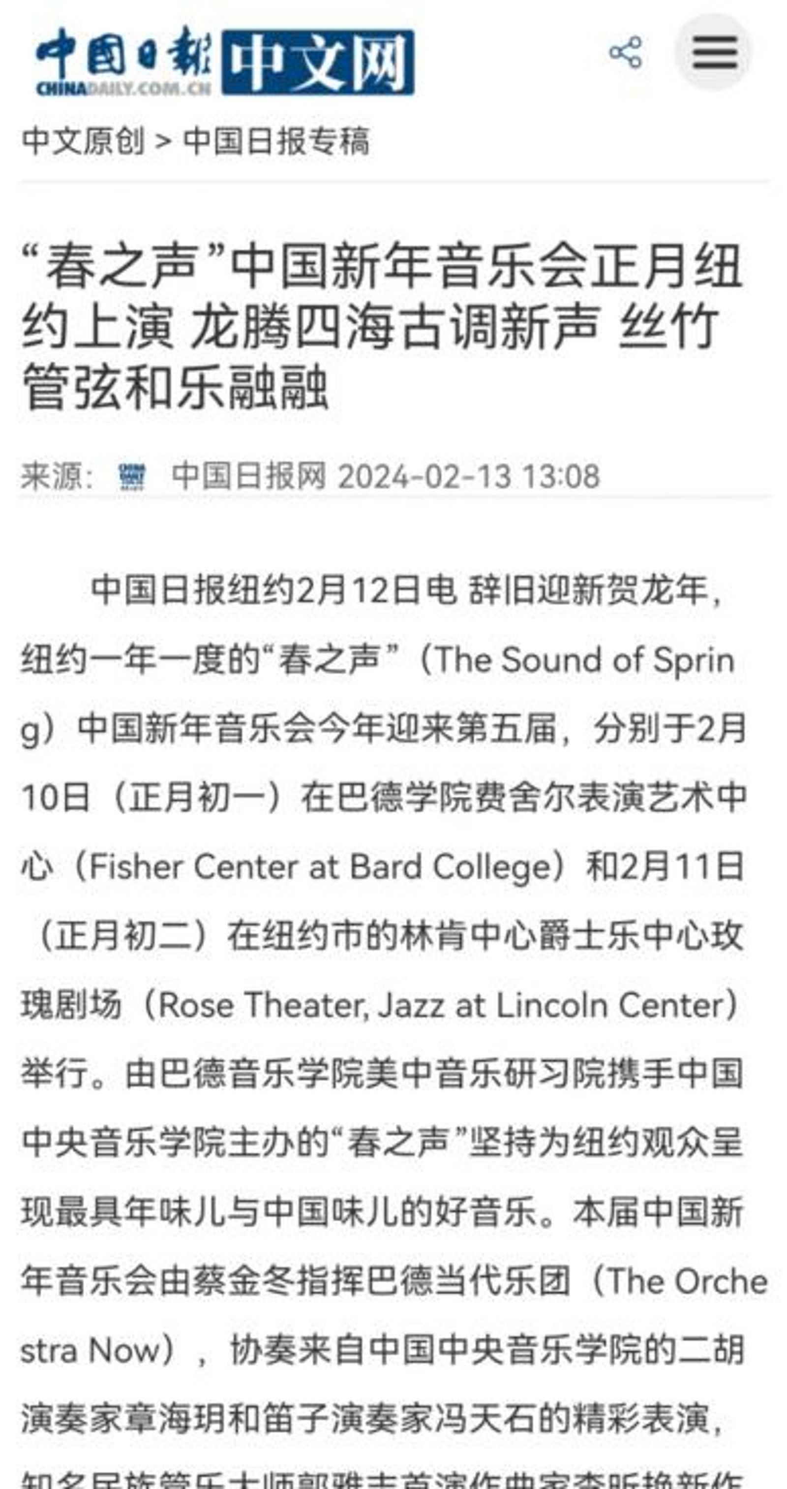 2月11日,由kaiyun体育网页登录入口携手美国巴德音乐学院美中音乐研习院主办的第五届“春之声”中国新年音乐会在纽约林肯中心爵士乐中心玫瑰剧场(Rose Theater, Jazz at Lincoln Center)举行。音乐会由蔡金东指挥,郭雅志、冯天石、章海玥担任独奏,巴德当代乐团协奏。中国驻纽约总领事黄屏、kaiyun体育网页登录入口党委书记于红梅及社会各界人士近千人出席。音乐会座无虚席,一票难求,外国观众反响热烈。