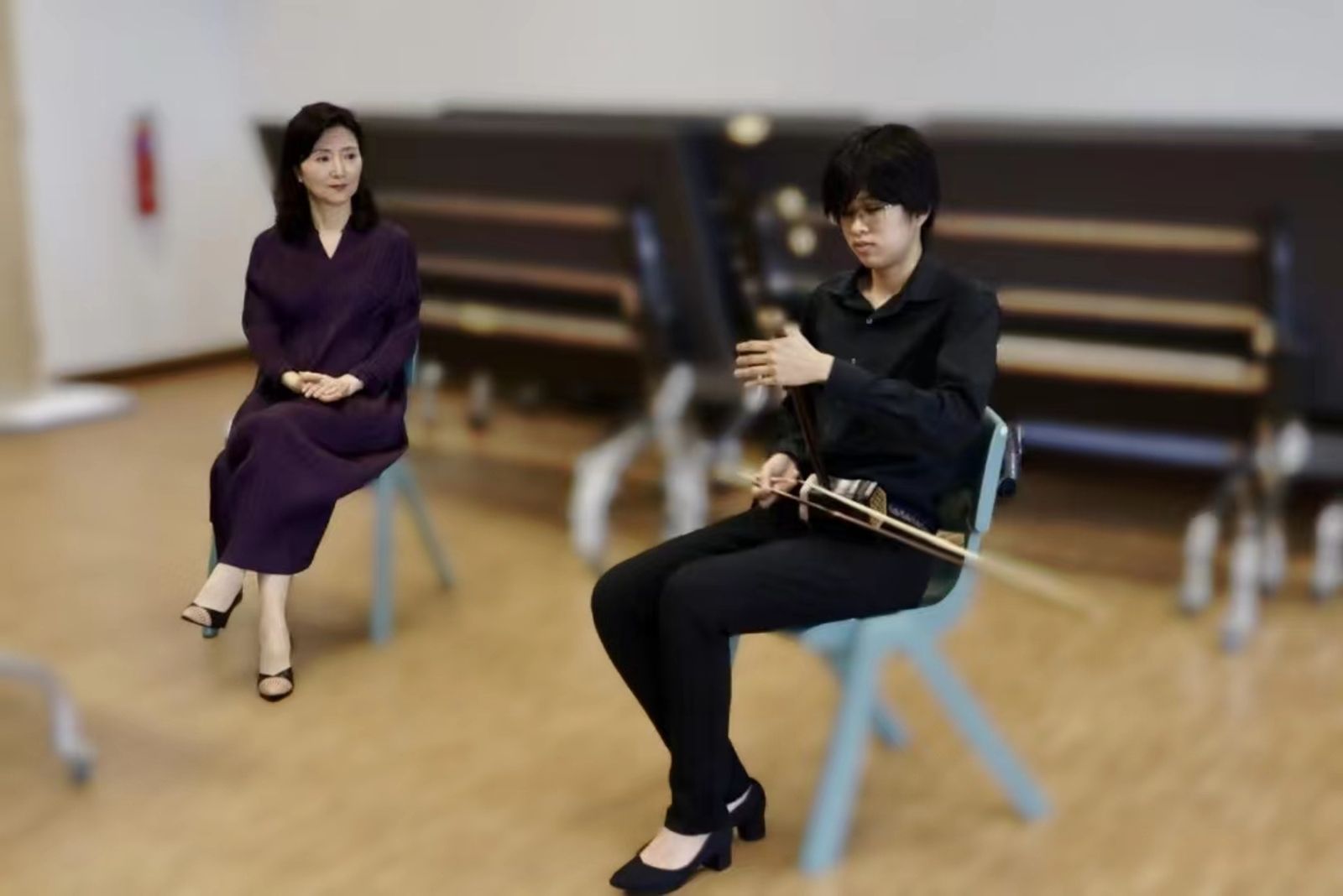 同日,于红梅教授为南洋艺术学院民乐专业师生举办二胡大师班。在聆听学生们的演奏后,于红梅针对如何培养演奏中的良好状态及练琴的科学有效性等方面进行指导,围绕审美意向、技术训练、表演心理、作品处理等方面分享心得,她希望新加坡青年学子在多元文化环境中兼收并蓄、博采众长,希望更多人了解中华传统音乐文化的时代价值和丰富内涵,希望以音乐之美架起文化交流之桥,为促进两国人民相知相亲贡献音乐力量。