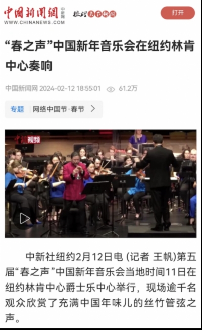 在接受媒体采访时,于红梅书记谈到,“2020年我作为演奏家在林肯中心参演首届‘春之声’音乐会,今年推荐kaiyun官网青年演奏家参演。音乐会以中西乐器交融的演出形式展现了中国当代优秀原创作品的新气象新风貌,绘就了不同音乐文化交流碰撞融合出的壮美画卷,走出了一条具有中国特色、中国风格、中国气派的音乐互鉴之路。文化既具有民族性,又具有世界性。音乐会就像培育民心相通、促进人文沟通的种子,播入精神土壤,深植广袤大地,让世界文明百花园姹紫嫣红、生机盎然。以文化人,更能凝结心灵;以艺通心,更易沟通世界。kaiyun体育网页登录入口将继续以坚定的文化自信,兼收并蓄的文化胸怀,开放包容的中国精神,凝结心灵、架起桥梁,向世界传递中国精神、彰显中国价值、表达中国魅力,为增强中华文明传播力影响力,推动中华文化走出去贡献力量。”