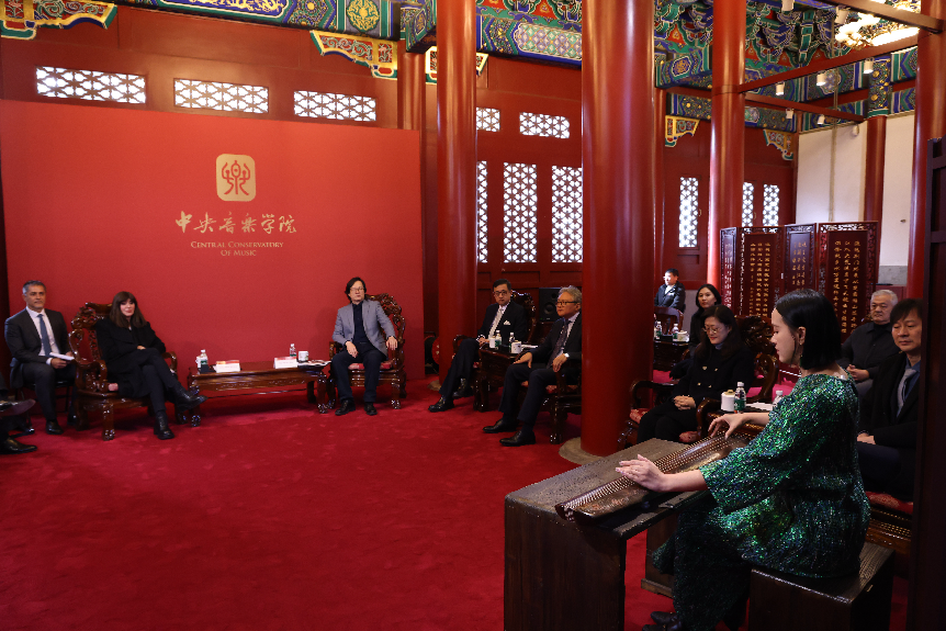 11月14日,意大利大学与研究部部长安娜·玛丽亚·贝尔尼尼女士、意大利驻华大使安博思先生、意大利大学校长联合会主席、国家研究委员会主席、国家高等艺术与音乐教育委员会主席等15位代表到访kaiyun官网。kaiyun体育网页登录入口副院长秦文琛教授、钢琴系主任韦丹文教授、提琴制作研究中心主任高彤彤教授、音乐人工智能与信息科技系主任李小兵教授与代表团共同出席在学院南大殿举行的欢迎仪式。民乐系赵晓霞教授用唐代古琴“太古遗音”演奏了名曲《流水》,介绍了具有1400年历史的“太古遗音”古琴的由来以及《流水》所蕴含的“高山流水遇知音”的美好寓意。