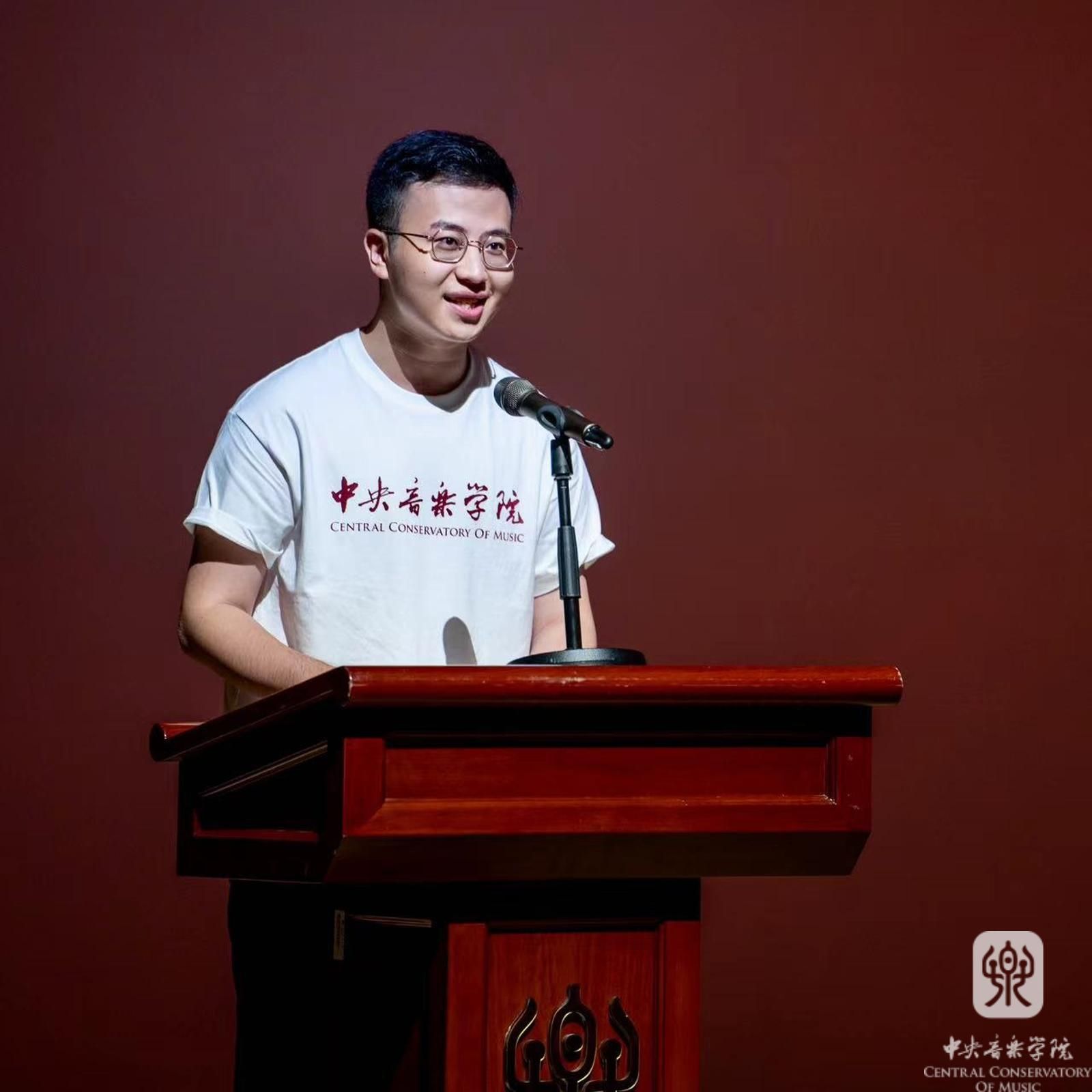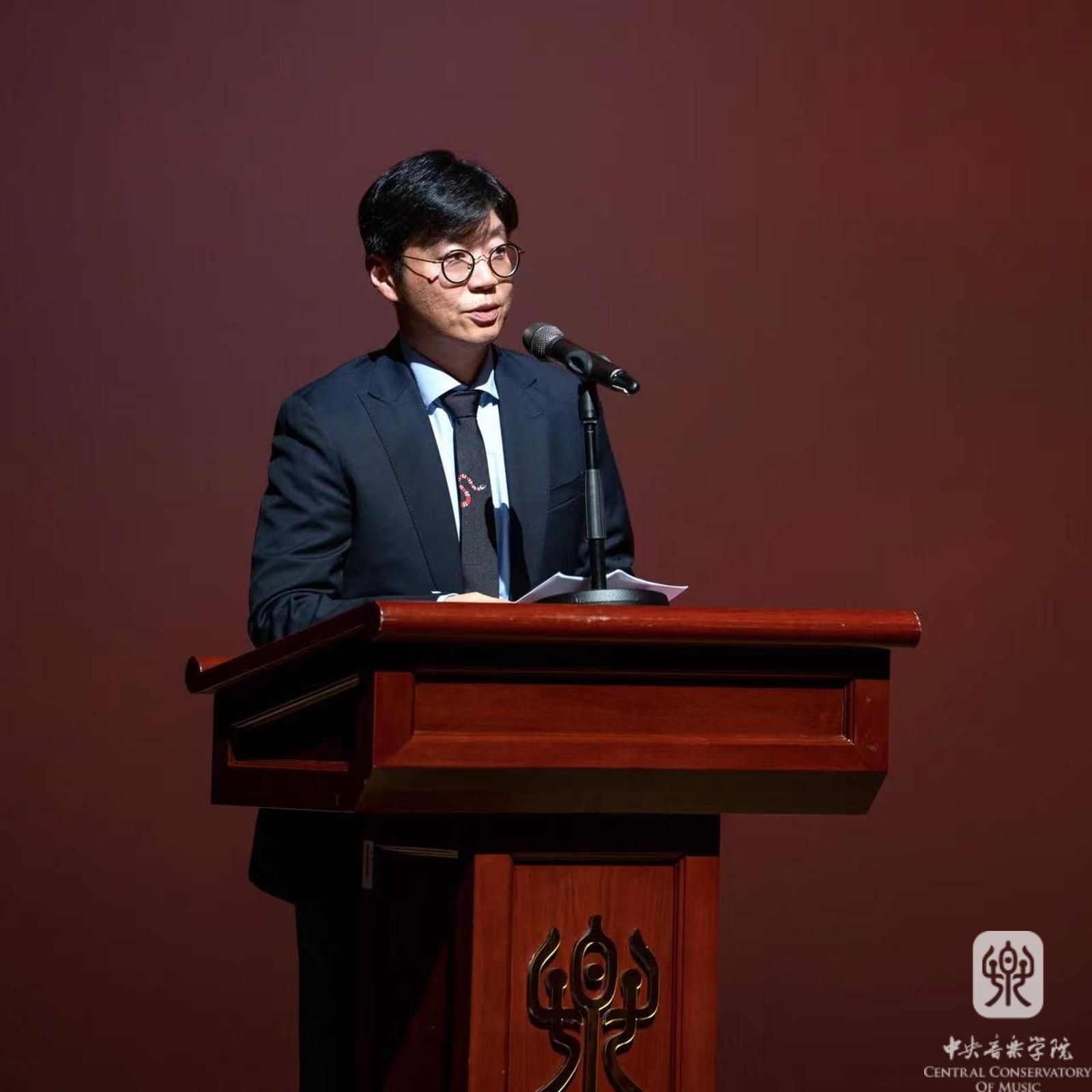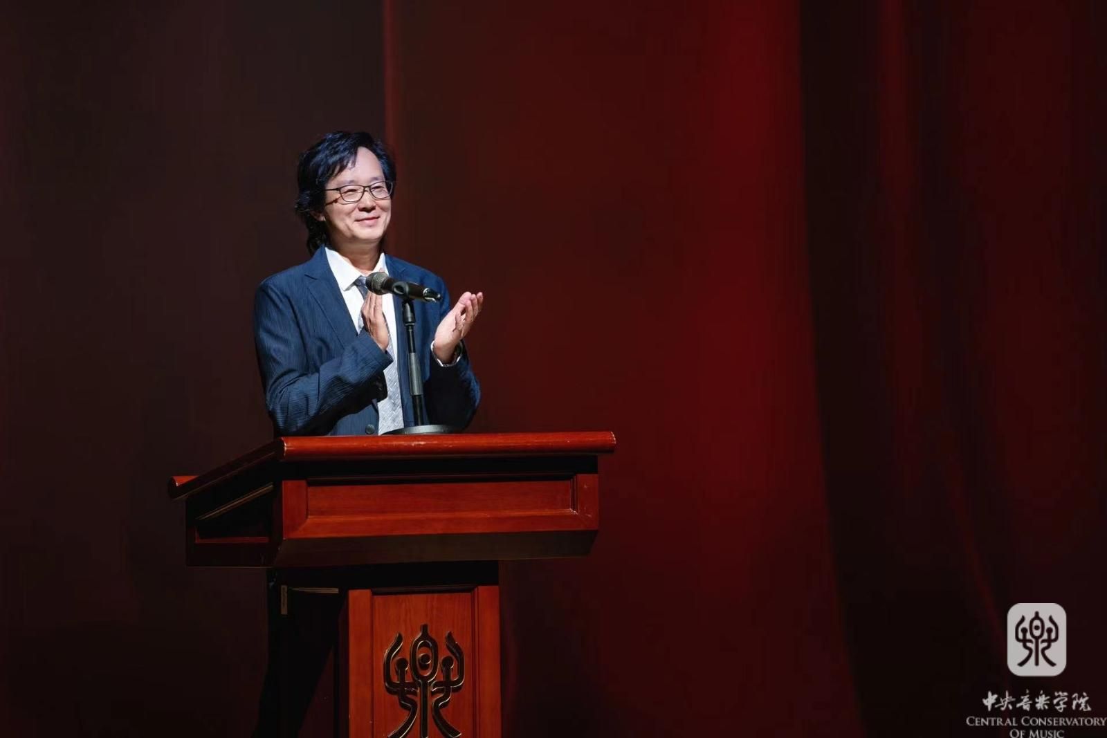 教师代表、管弦系主任刘洋教授发言,将“玩命练,守规矩”的座右铭与同学们分享。他表示,“玩命练”意味着唯有投入足够的时间,才能挖掘出自己的音乐天赋,“守规矩”有助于稳步前行,不留遗憾。他希望同学们不忘初心,永远保有对知识的渴望和热忱,也表示自己将继续满怀热情地关爱每一位学生,热爱这份神圣的教师职业,并将老教授们留下的优良传统薪火相传。