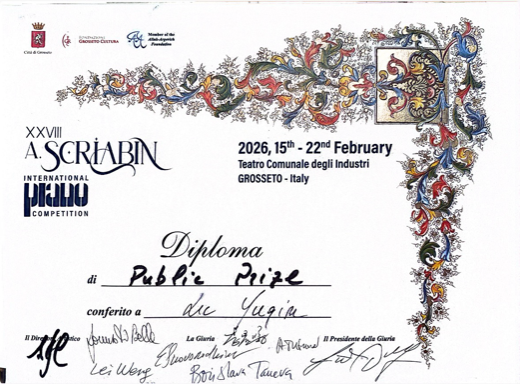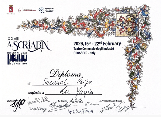 1. 第28届亚历山大·斯克里亚宾国际钢琴比赛 第二名,并获“观众特别奖”(2026)