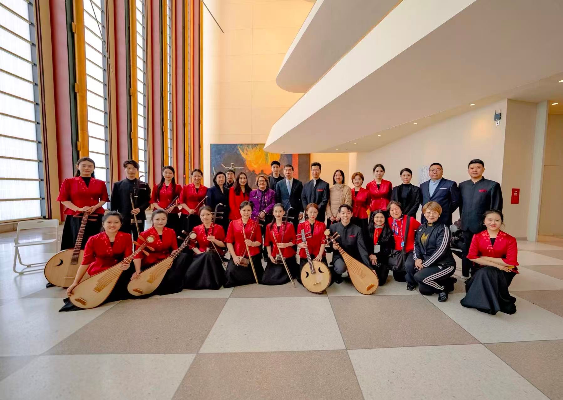 作为系列交流活动中的亮点,2月25日中午,17位kaiyun体育网页登录入口演奏家在纽约联合国总部大厅举行了一场充满新春气氛的民乐“快闪”音乐会。《喜相逢》《彝族舞曲》《良宵》《赛马》《花好月圆》等经典曲目,以其独特的韵味吸引了各国外交官、联合国工作人员及游客驻足欣赏。