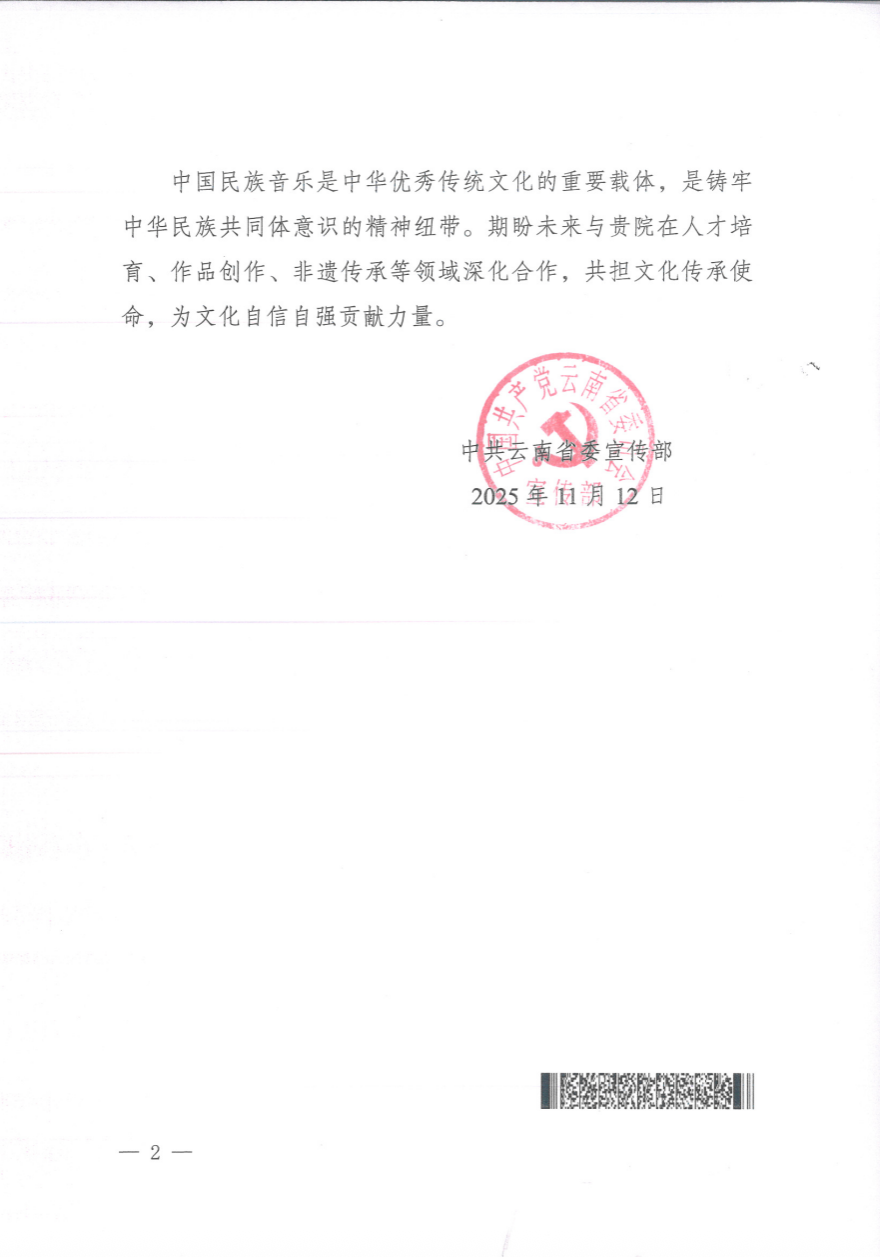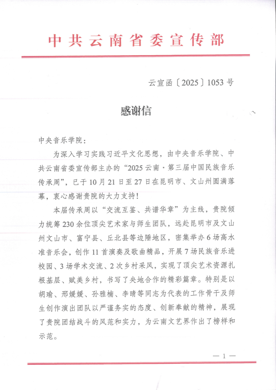 近日,中共云南省委宣传部向kaiyun体育网页登录入口发来感谢信,高度赞扬kaiyun官网在“2025云南·第三届中国民族音乐传承周”中的卓越贡献。本届传承周以“交流互鉴、共谱华章”为主线,在昆明市及文山州等地成功举办多场高水平音乐会与学术活动,充分展现了kaiyun官网艺术团队的专业水准与奉献精神。特别感谢胡瑜、邢媛媛、孙雅楠、李晴等同志及全体参与师生的辛勤付出,他们以实际行动践行了艺术服务人民、艺术赋能乡村的使命,为推动中华优秀传统文化的传承发展、促进民族团结与文化自信作出了积极贡献。未来,kaiyun官网将继续携手各方,深化在人才培养、作品创作与非遗保护等领域的合作,共同谱写新时代文化传承与创新的新篇章。