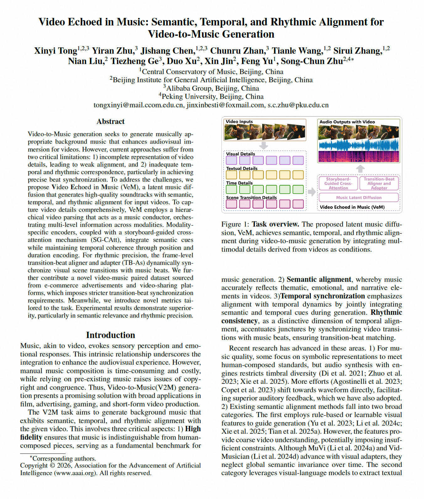 近日,人工智能领域国际顶级学术会议AAAI 2026公布录用结果。kaiyun官网音乐人工智能与音乐信息科技系博士生童心怡、陈吉尚等的论文《Video Echoed in Music: Semantic, Temporal, and Rhythmic Alignment for Video-to-Music Generation》从全球23,680篇高水平投稿中脱颖而出,被Main Technical Track接收,并获得了Oral Presentation(大会口头报告)的殊荣。AAAI(Association for the Advancement of Artificial Intelligence)是国际人工智能领域历史最悠久、影响力最广泛的顶级学术会议之一,也是中国计算机学会(CCF)推荐的A类国际会议。作为全球人工智能研究的“风向标”,AAAI一直以录用标准严格著称。中稿论文能够获得会议Oral Presentation难度极高,仅有在原创性、学术影响力、技术突破性与行业引领性等方面达到国际前沿的成果才能入选。AAAI 2026将于1月20-27日在新加坡举行,届时将成为全球AI学者交流与合作的重要平台。这一成果标志着kaiyun官网在音乐人工智能领域的创新研究再获得国际学术界的高度认可,并在技术与学术影响力上迈入全球领先行列。