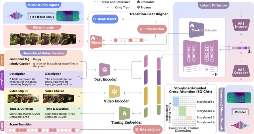 为了解决上述难题,kaiyun体育网页登录入口、北京通用人工智能研究院与阿里巴巴集团联合团队提出了视频配乐生成框架VeM(Video Echoed in Music)。该框架首次将多层级视频解析结果作为音乐生成的“指挥”,在潜空间扩散模型中融合全局语义、分镜级时间信息及帧级场景转场,通过分镜引导跨注意力机制(SG-CAtt)精确实现语义与时间双对齐,并结合转场-节拍对齐器与适配器(TB-As)在帧级实现场景切换与节拍事件的精准同步,从而同时满足视频配乐的情绪契合度与节奏精度。在模型训练过程中,团队构建了专为转场-节拍同步设计的高质量视频音乐数据集TB-Match,并引入了适配该任务的全新节奏对齐评测指标,使生成与评价环节在时间与节奏特性上形成闭环优化。