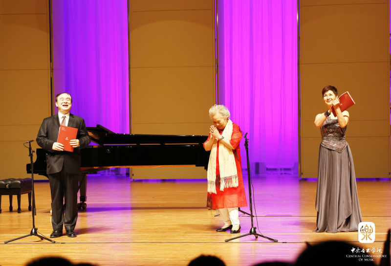 俞峰院长在演出前代表学院发表热情洋溢的致辞。他说,在郭老师长长的光荣簿中,他最看重的是1952年郭老师加入中国共产党;1958年她以优等生的成绩从莫斯科柴可夫斯基音乐学院毕业,并荣获"歌剧和音乐会优秀歌唱家"称号,她的名字被镌刻在学院金榜上;1995年获北京市先进工作者及全国文化系统先进工作者称号;2005年被评为全国模范教师;2005年和2006年分别获得全国高校和北京市优秀共产党员称号。这说明她是一位德艺双馨的艺术家,又是教书育人的辛勤园丁。她长期坚持在声乐教学第一线,不仅教授声乐技巧,还注重对学生的思想政治教育,为声乐学科和国家艺术事业的发展,呕心沥血,无私奉献。学院在她90岁生日之际为她举办这样一个纪念活动,是要以她为榜样,弘扬她的这种爱国、爱党、爱学院、爱学生、爱事业的精神,引领大家努力提高专业音乐教育的质量和水平。