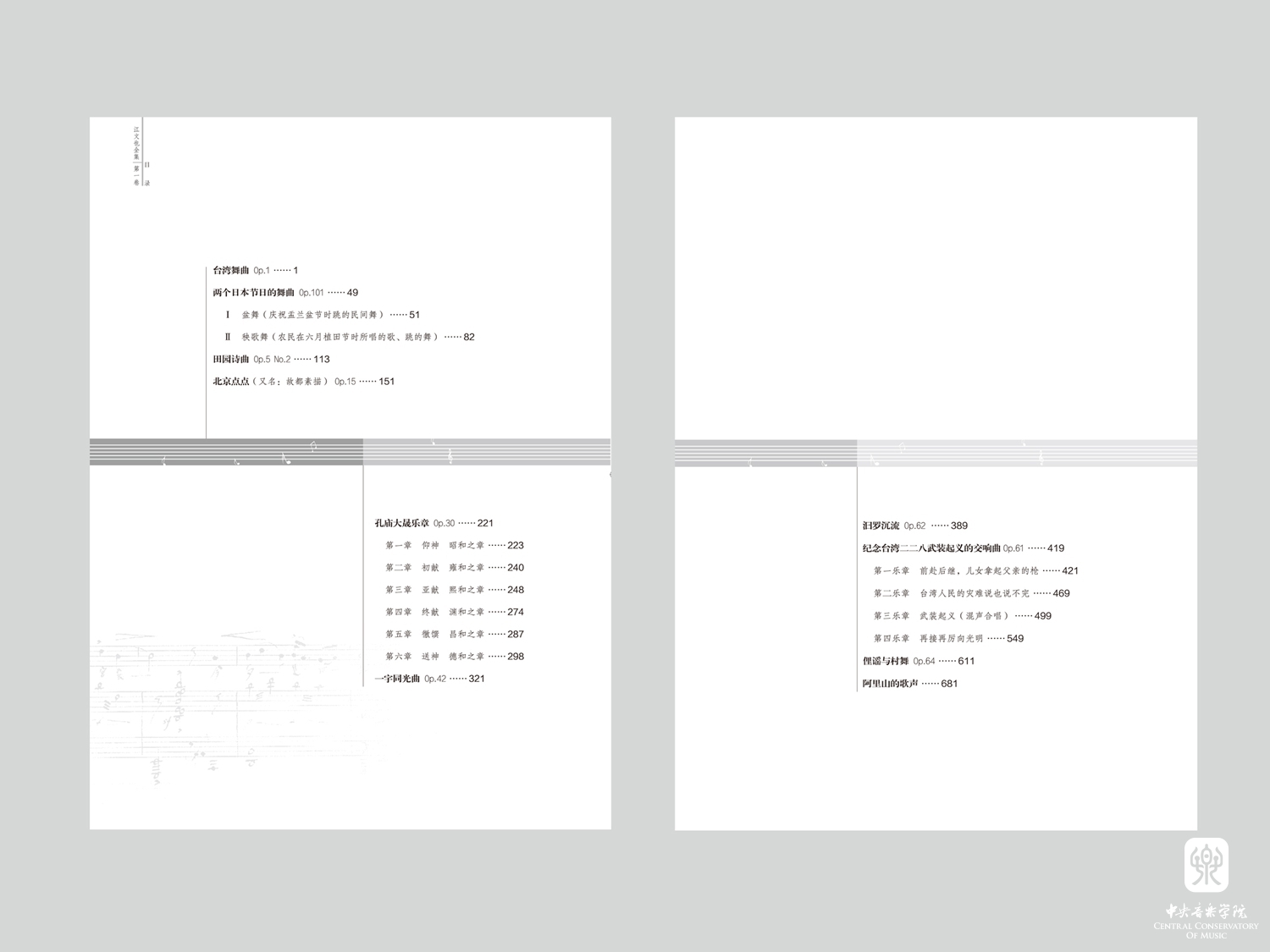 本卷共收录管弦乐作品10部,除了《台湾舞曲》《汨罗沉流》之外,其余皆为首次正式出版。作者生前最后1部作品《阿里山的歌声》,在此为手稿扫描版。