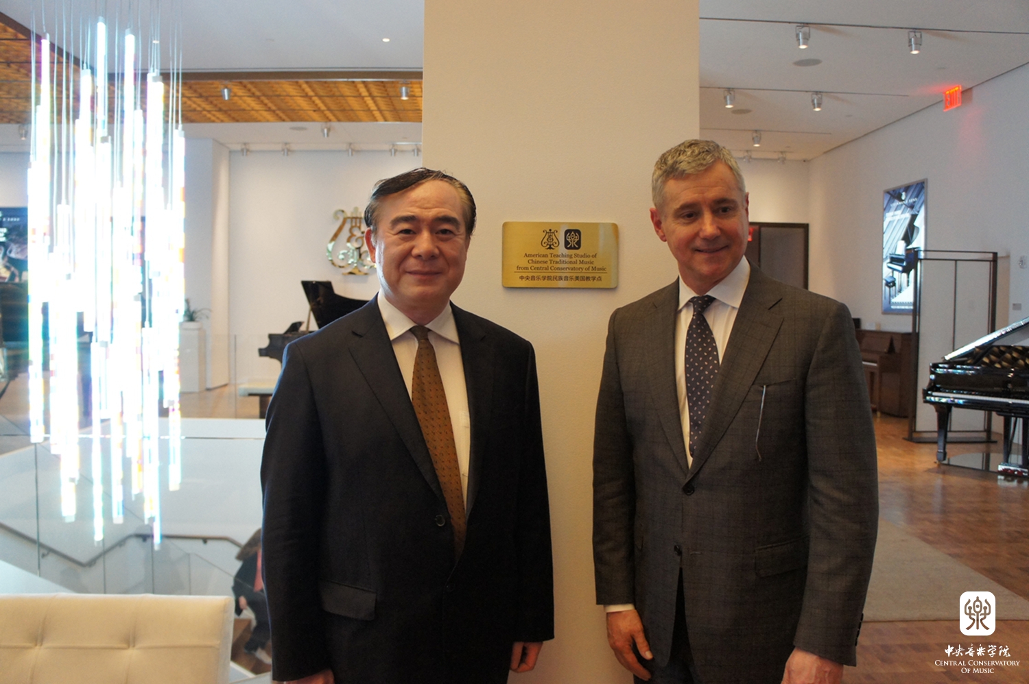 | 俞峰院长与罗斯彼总裁在“民族音乐美国教学点”牌匾前合影 |