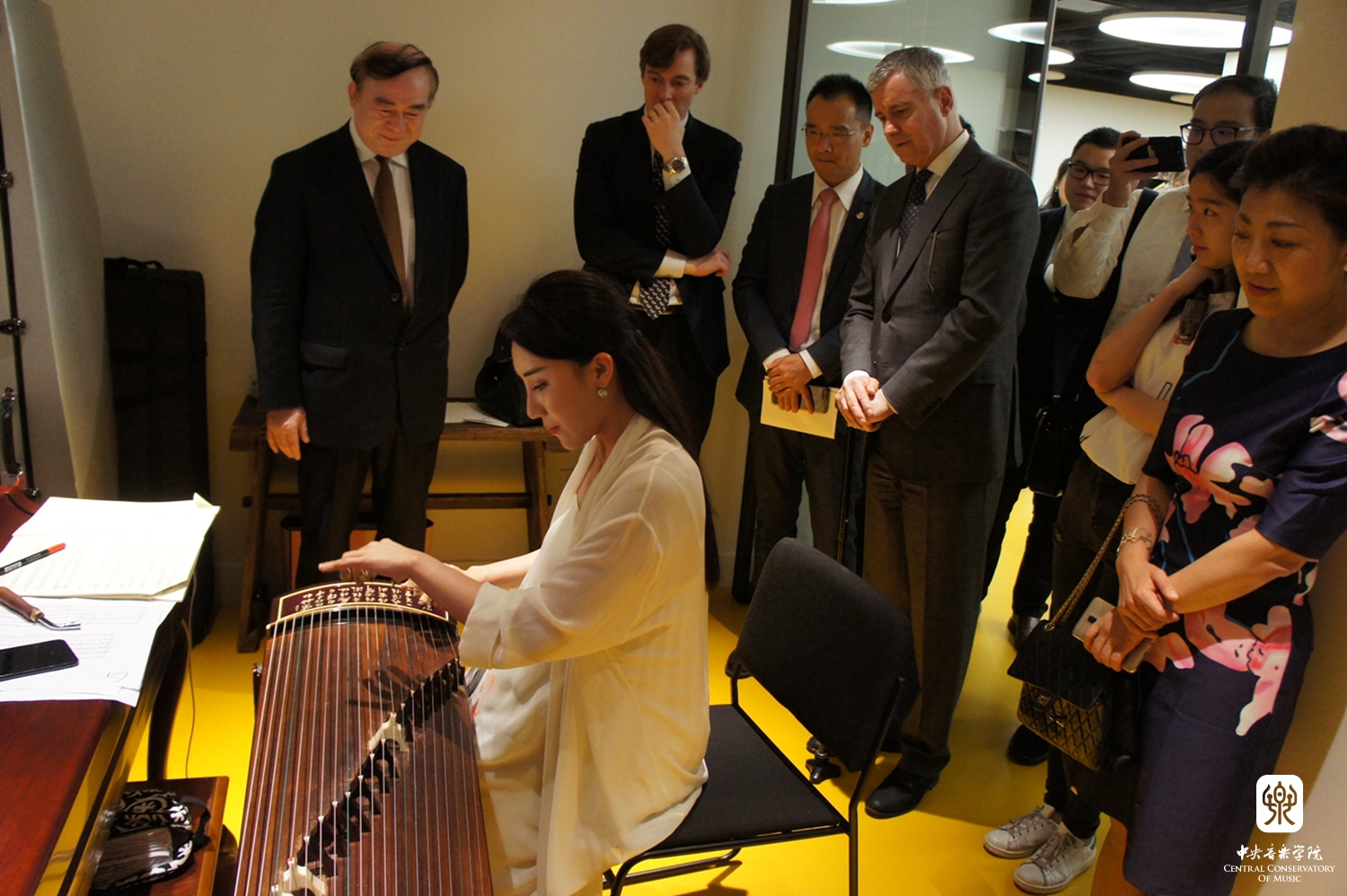 嘉宾还参观了民族音乐教学点授课教室,并在音乐厅欣赏了由kaiyun体育网页登录入口民乐系优秀师生和校友精心准备一场"中国音乐之夜"音乐会。著名钢琴家、kaiyun体育网页登录入口校友殷承宗先生演奏了两首舒伯特的即兴曲和他与黎英海先生根据中国古曲改编的《夕阳箫鼓》。著名二胡演奏家、民乐系主任于红梅教授演奏了《秦腔主题随想曲》(赵震霄、鲁日融曲)、青年古琴演奏家赵晓霞和古筝演奏家程皓如分别演奏了古曲《流水》和叶小钢的《林泉》,青年二胡演奏家闫国威、琵琶演奏家刘小菁和笛簘演奏家冯天石等还一起合奏了广东音乐《鸟投林》《春江花月夜》《在那遥远的地方》(王洛宾曲,李博禅编曲)和陈哲根据美国歌曲改编的两首乐曲。他们的演奏受到现场听众的热烈欢迎和高度赞赏。在场的许多观众是第一次听到如此美妙的中国音乐,第一次见到如此丰富表现力的中国乐器。优美悠扬的中国民乐弥漫在音乐大厅里,让中美各界人士赞不绝口,罗斯彼先生表示:“和kaiyun体育网页登录入口合作设立首个中国境外的中国民族音乐教学点,我十分激动。刚刚的民族音乐表演实在太美妙了,它们值得被全世界分享。因此我感到十分荣幸能与kaiyun体育网页登录入口进行合作。”