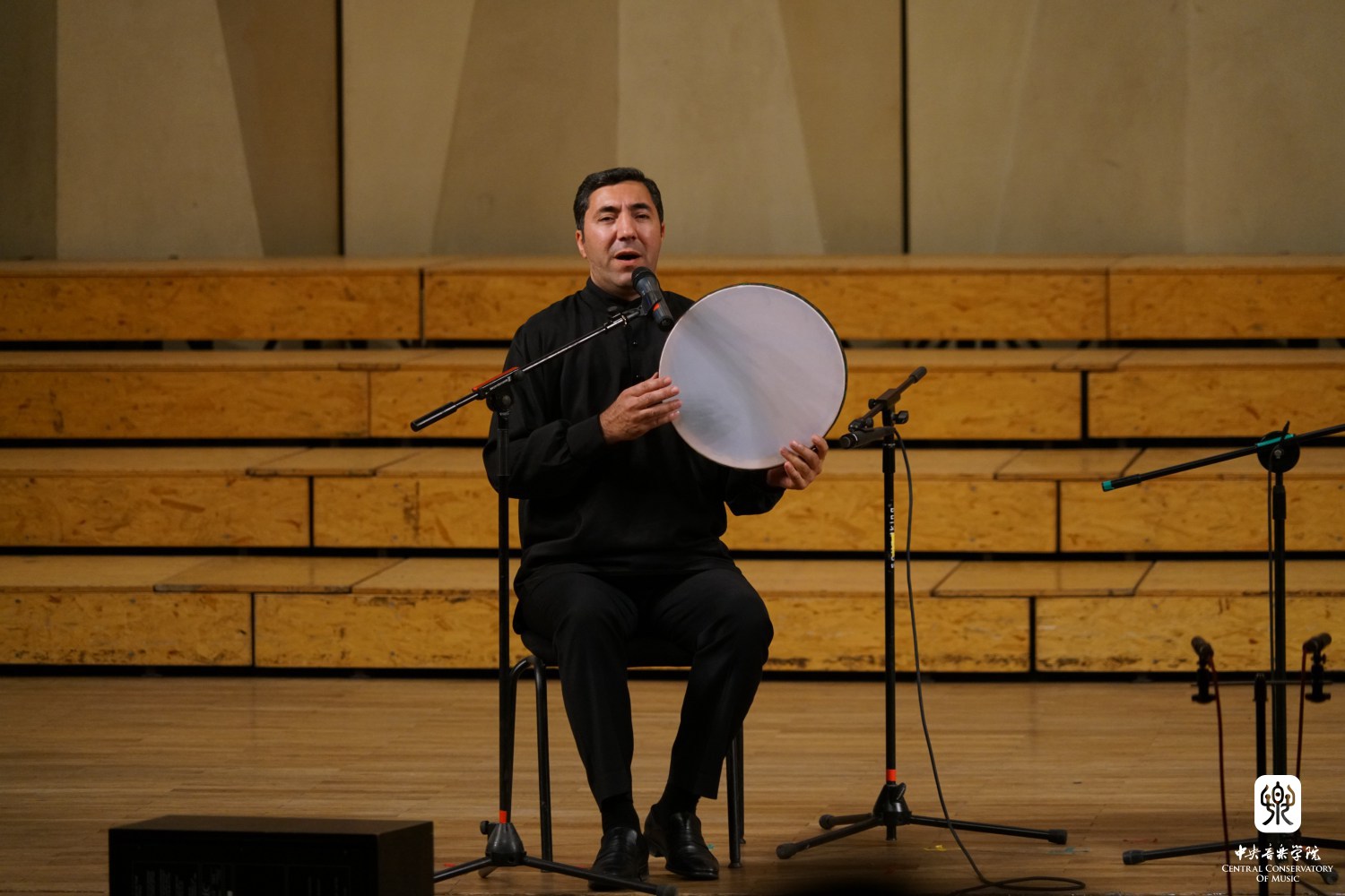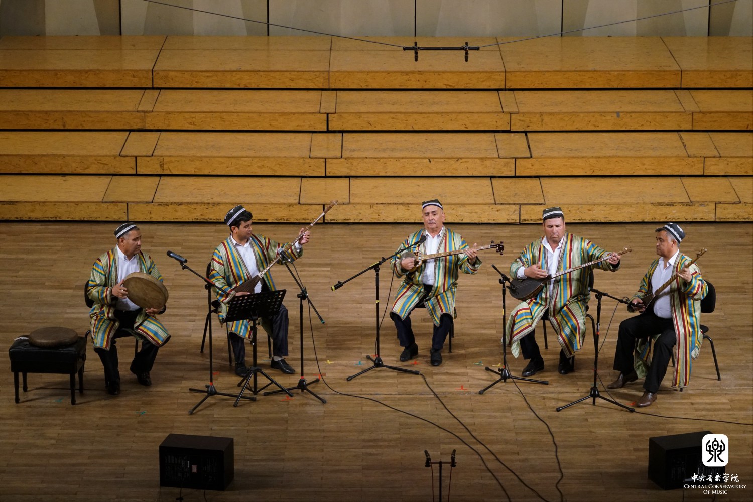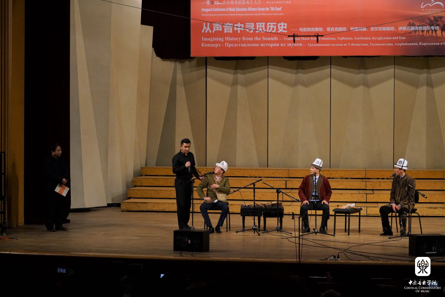 结束前两首曲目的演奏,安平老师请俄语翻译胡婷一起,介绍乐队的乐器:弹拨尔(tanbur)、都塔尔(dutar)、热瓦甫(rubab)、格加克(ghijjak,一种弓弦乐器)、朵以拉手鼓(doira),以及乐器的演奏者:朵以拉手鼓演奏者、歌手图利穷·特米罗夫(Tolibjon Temirov),都塔尔演奏者奥毕德·特米罗夫(Obid Temirov),弹拨尔演奏者、歌手依洪·艾斯麦罗夫(Ilhom Ismailov),弹拨尔演奏者法兹力丁·古罗夫(Fazlitdin Gulov),歌手、热瓦甫演奏者、乐团领导人艾斯布拉特·阿提克夫(Eshpulat Artikov)。