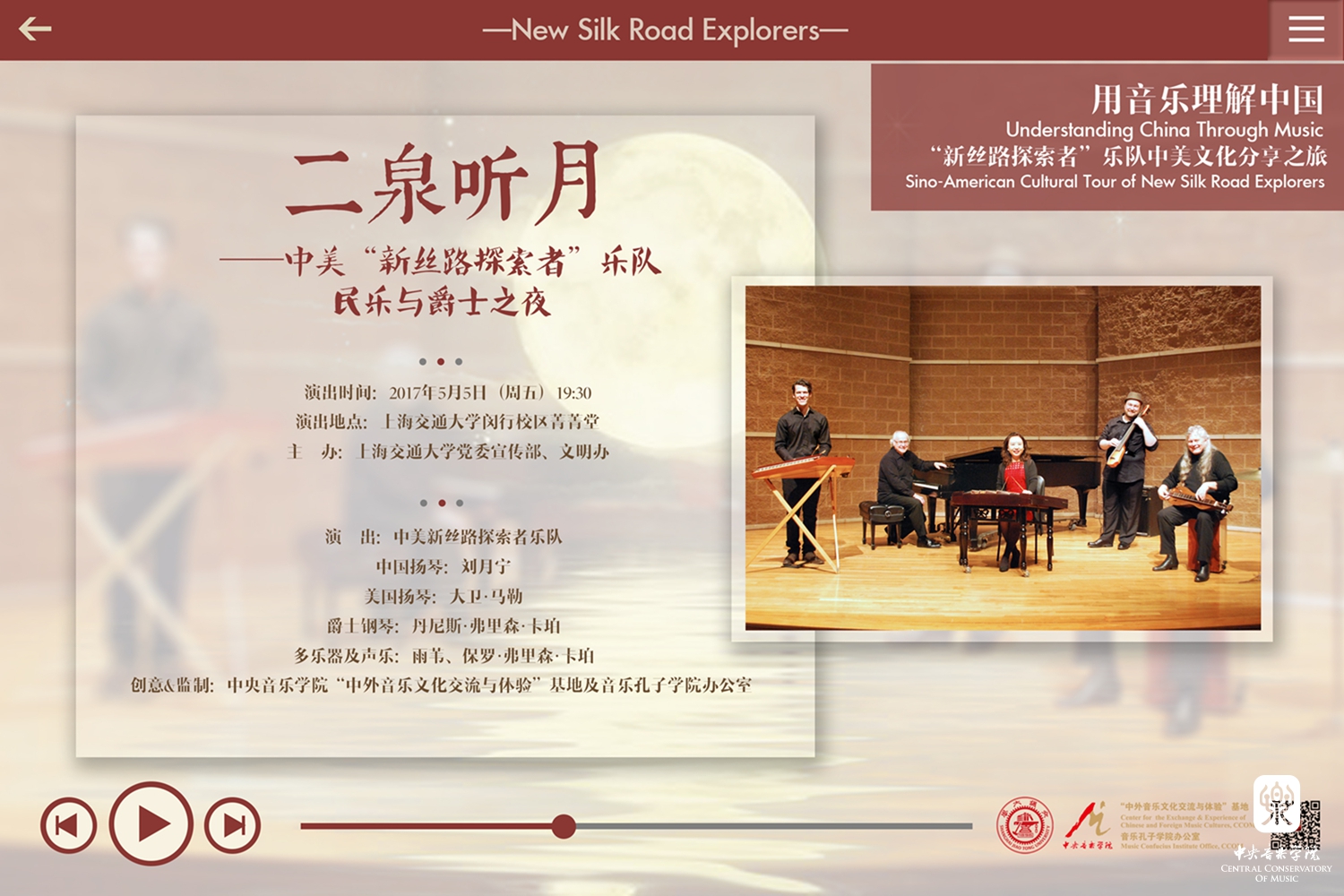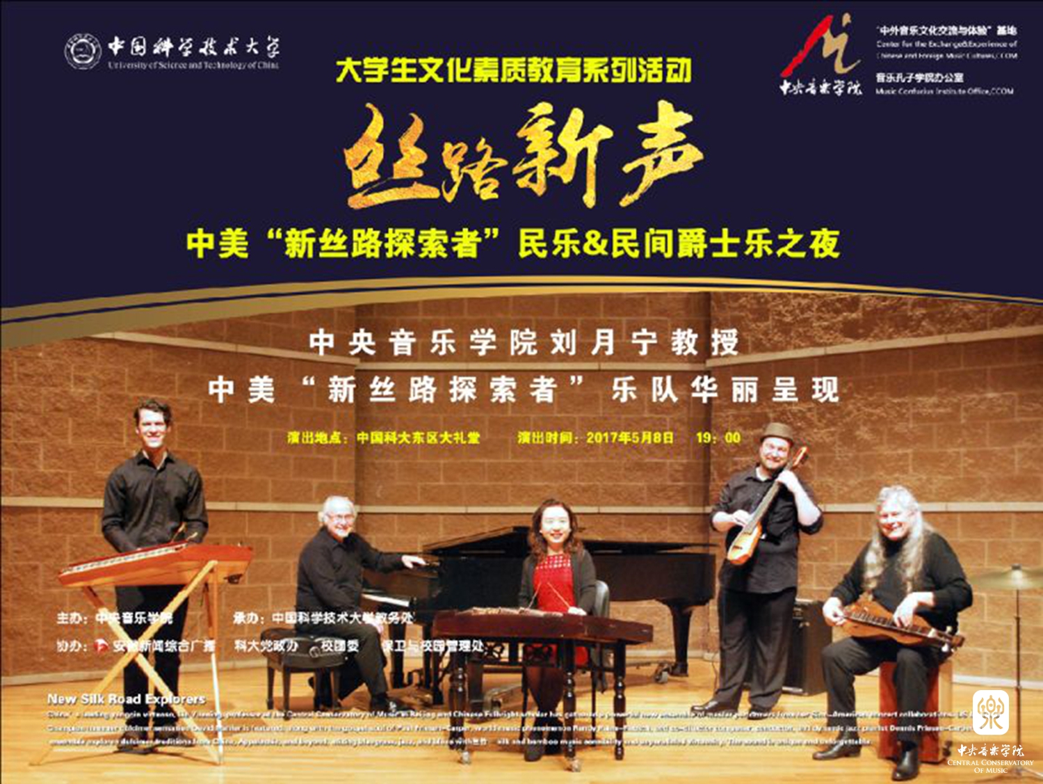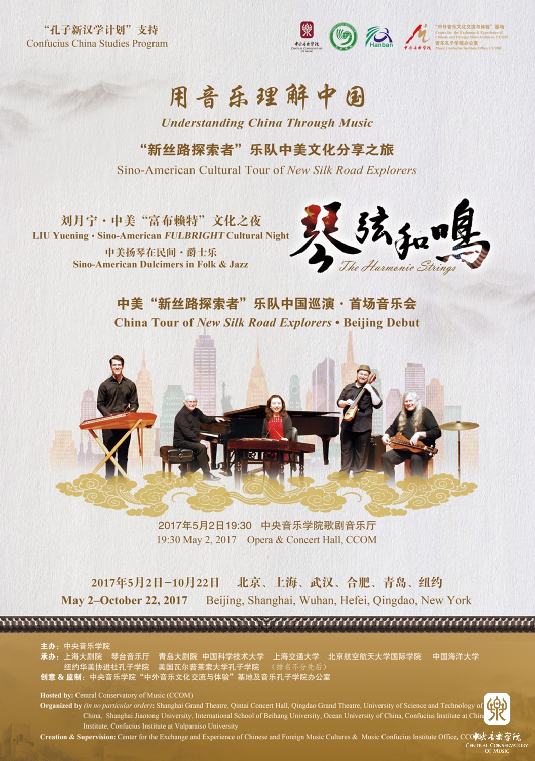 2017年5月2日至5月13日,由孔子学院总部及社会各界支持、kaiyun体育网页登录入口主办、“中外音乐文化交流与体验”基地及音乐孔子学院办公室创意监制的“用音乐理解中国——‘新丝路探索者’乐队中美音乐文化分享之旅”中国巡演阶段圆满落幕。乐队由kaiyun官网刘月宁教授领衔,与美国青年扬琴演奏家大卫,爵士钢琴家、作曲及指挥家丹尼斯教授,多乐器演奏家、创作型歌手保罗,多乐器演奏家、音乐制作人雨苇共同组成。在12天的巡演中,乐队走访了北京、上海、武汉、合肥、青岛5个城市,举办了9场主题音乐会、艺术分享和文化交流活动,近7000名嘉宾及各界观众参与,中央电视台、中国教育电视台、北京电视台、China daily、中国网、中青网、中新社、中国艺术报等十余家主流媒体发布专题报道。