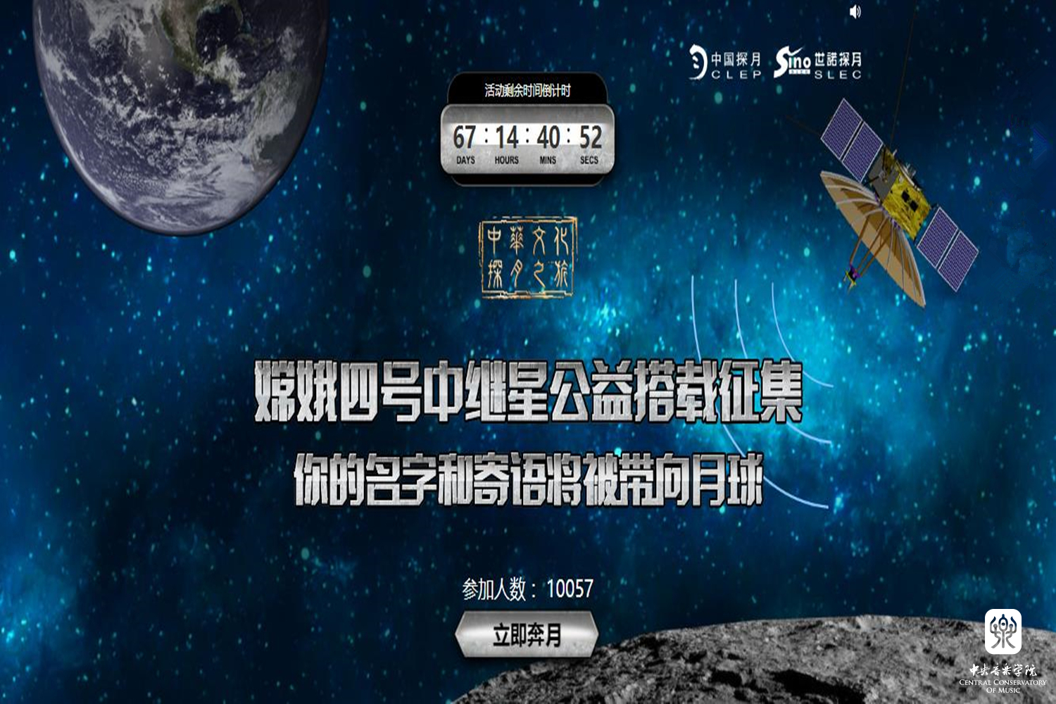 2017年12月19日,嫦娥四号中继星公益搭载全球征集活动正式开始,中华文化探月之旅即将启程,让寄语带着我们最深沉的情感,让每一个人的名字带着最美好的向往,携央音管弦一起飞天!加油中国!加油中国探月!
