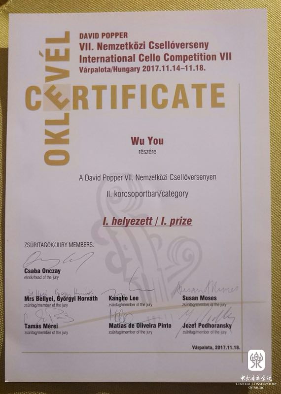 据悉,在今年5月附中举办的校内奖学金制比赛中,吴优荣获了大提琴专业二等奖的优良成绩。此次摘得第7届匈牙利"大卫·波帕尔"国际大提琴比赛少年组的第一名,再次刷新奖项荣誉。这份殊荣充分体现了近年来附中大提琴教学的优异成果。年轻的学子们在专业老师们的精心教导下,已经逐渐在世界舞台上崭露头角,期待他们再接再厉,获得更好的成绩!