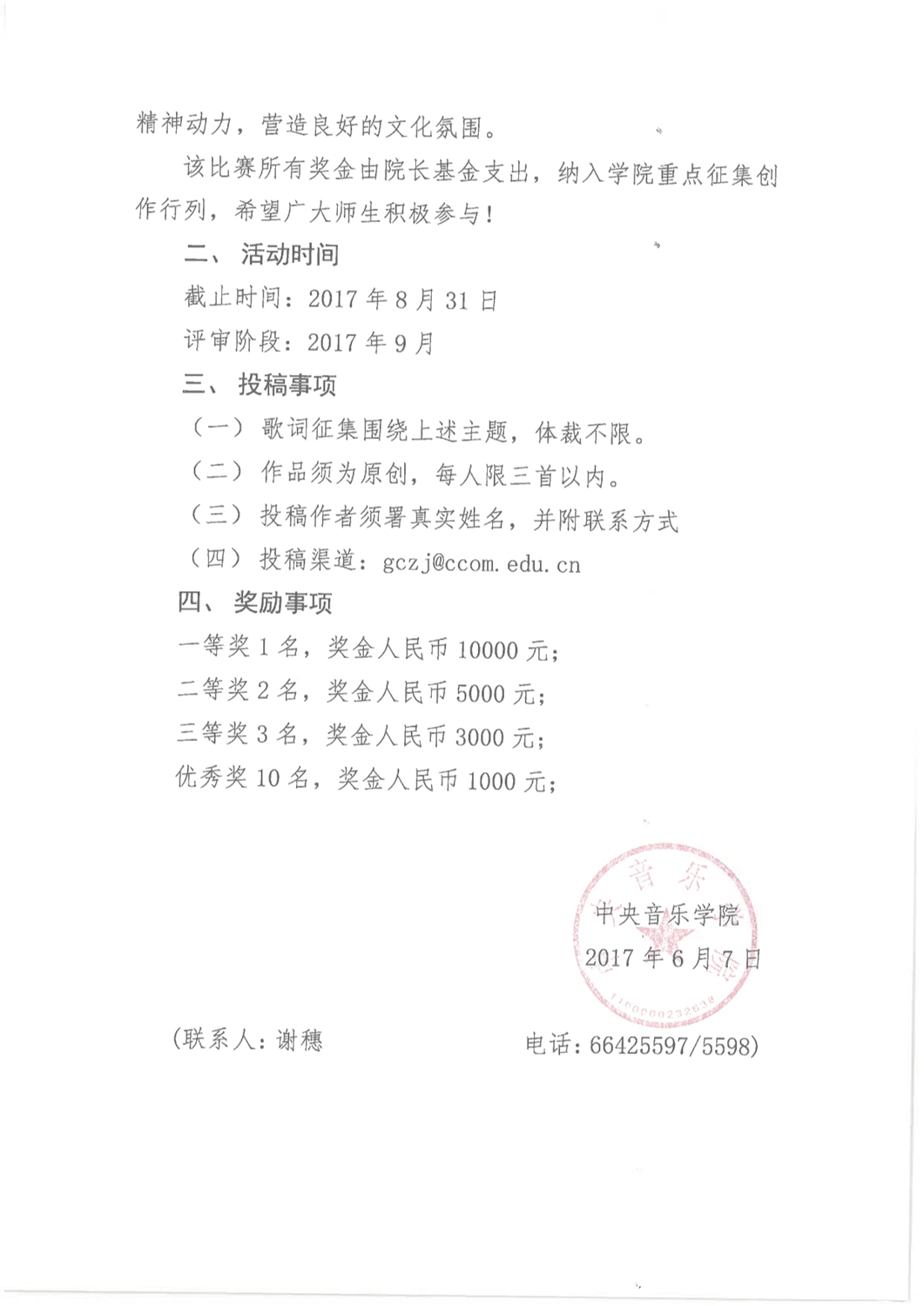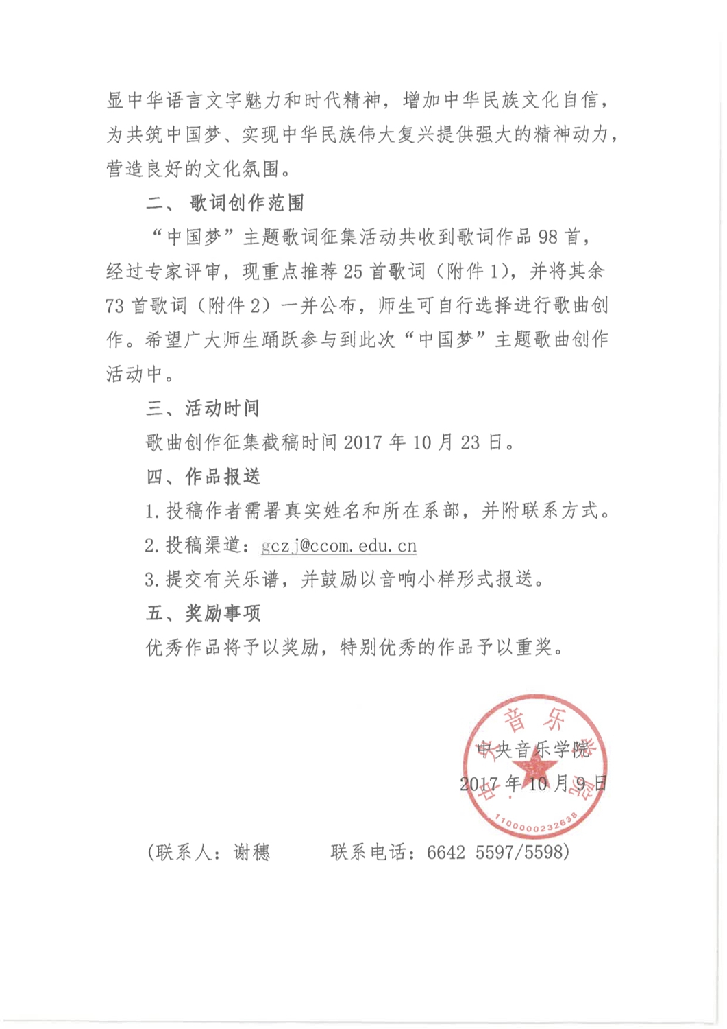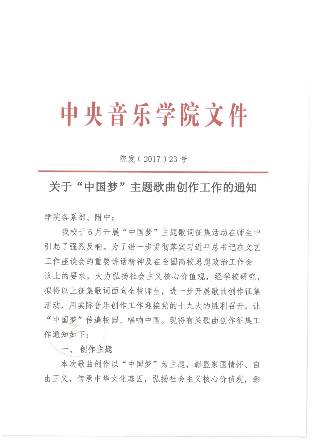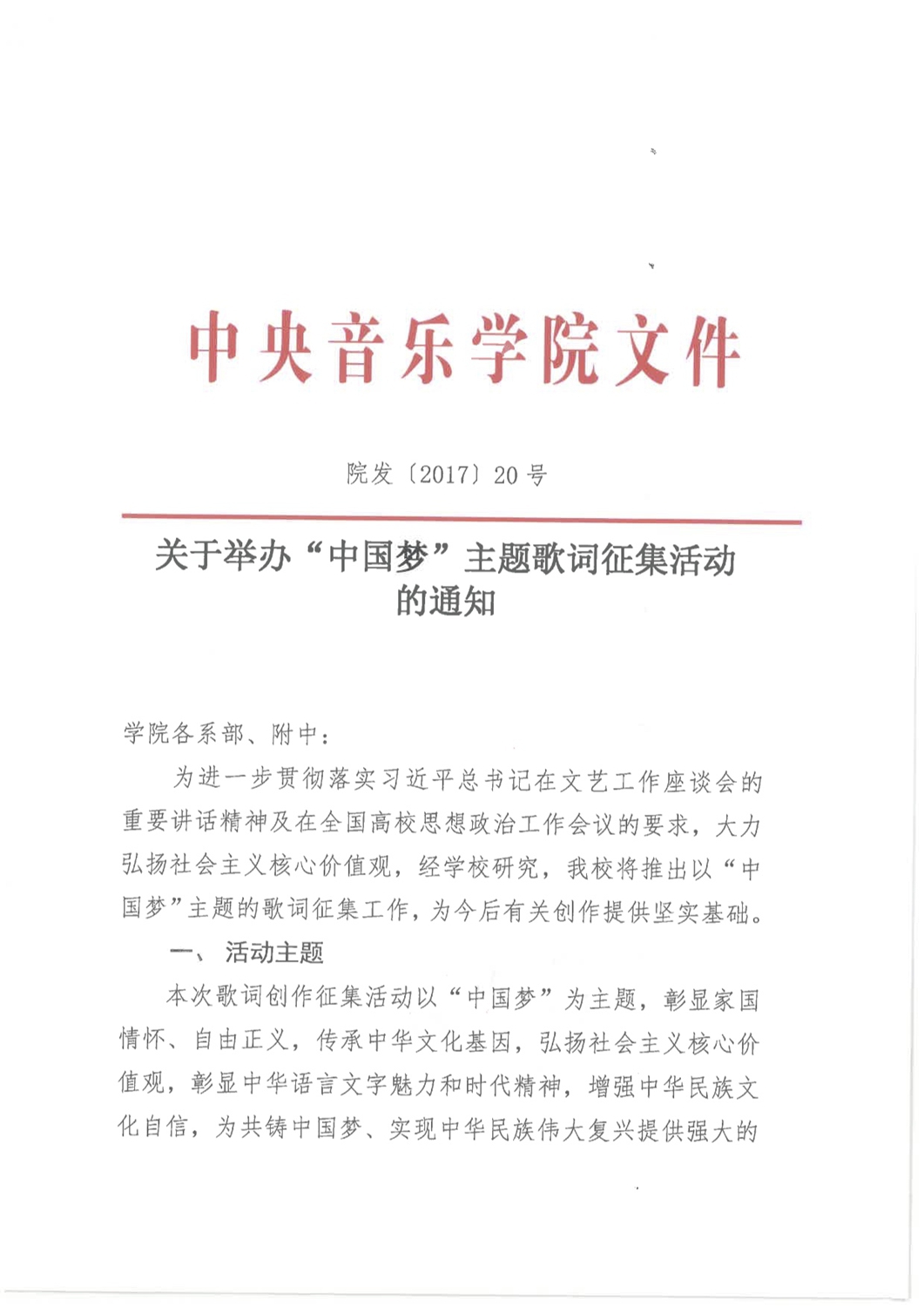 为迎接党的“十九大”胜利召开,贯彻和践行习近平总书记在文艺工作座谈会的重要讲话精神及在全国高校思想政治工作会议上的要求,校领导直接部署,院长办公室于6月向全院教职员工发出“中国梦”主题创作活动的通知。在学年最后一次中层干部会议上,俞峰院长发出动员,要求全体中层干部广泛宣传、积极动员,发动广大师生和教职员工踊跃投稿,通过“中国梦”歌词征集活动,让广大教职员工投入到“中国梦”的学习和创作中,全新创作出一批彰显时代精神、广为传唱的经典作品。