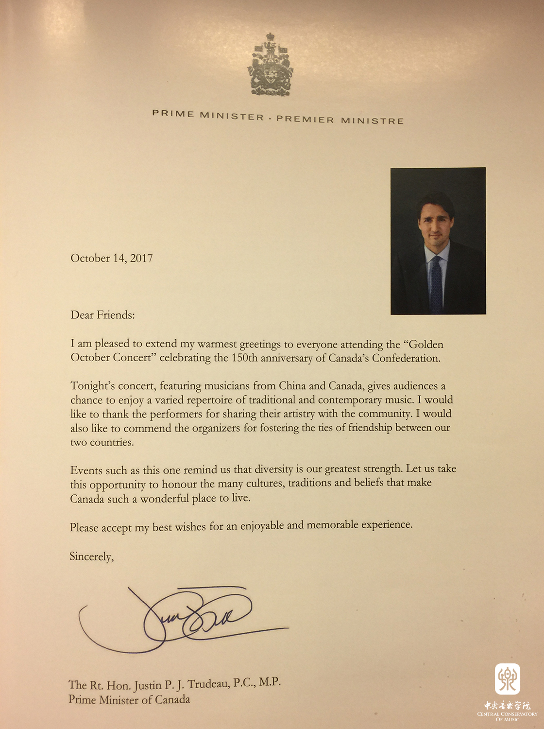 加拿大总理贾斯廷·特鲁多先生贺信