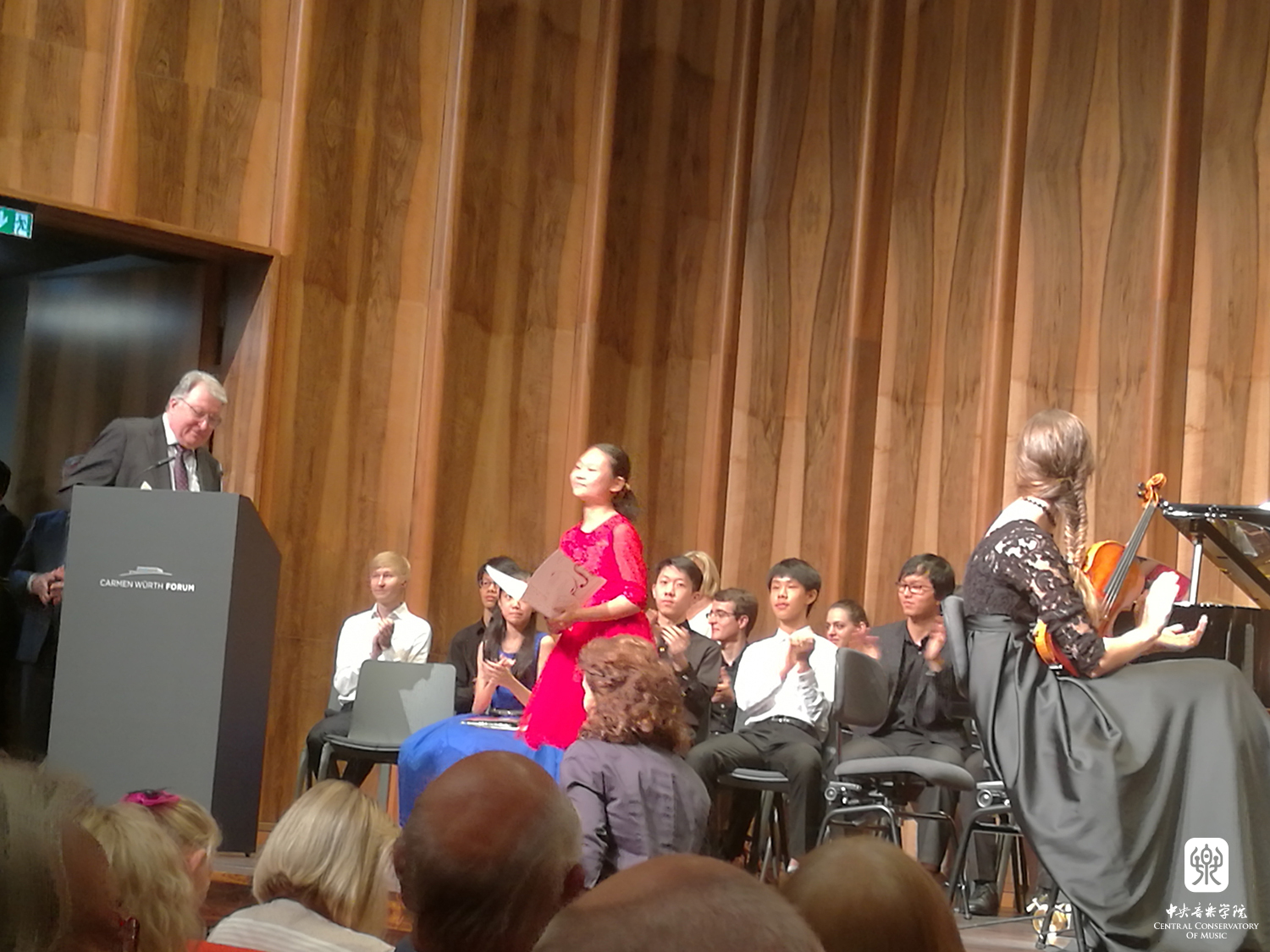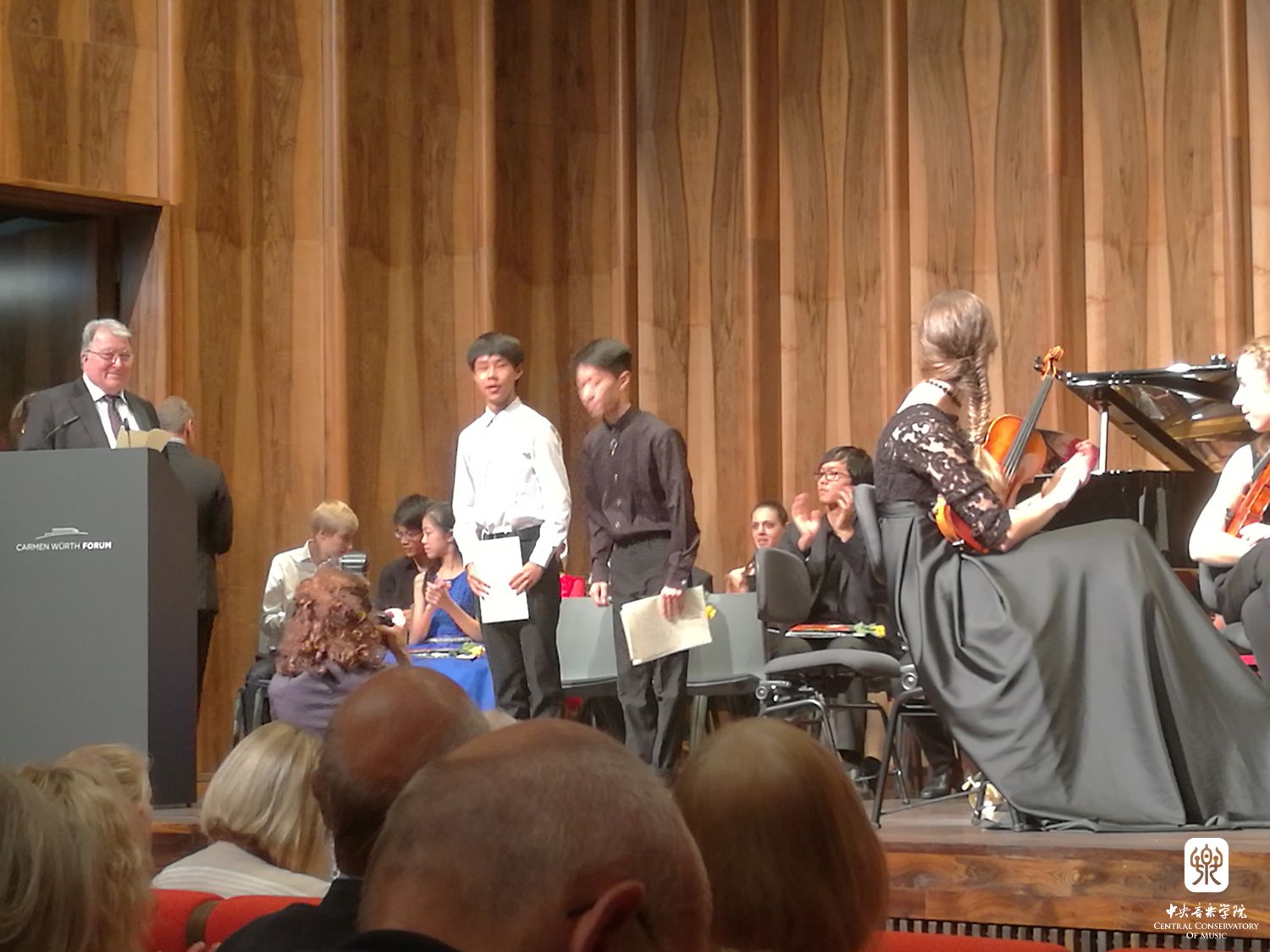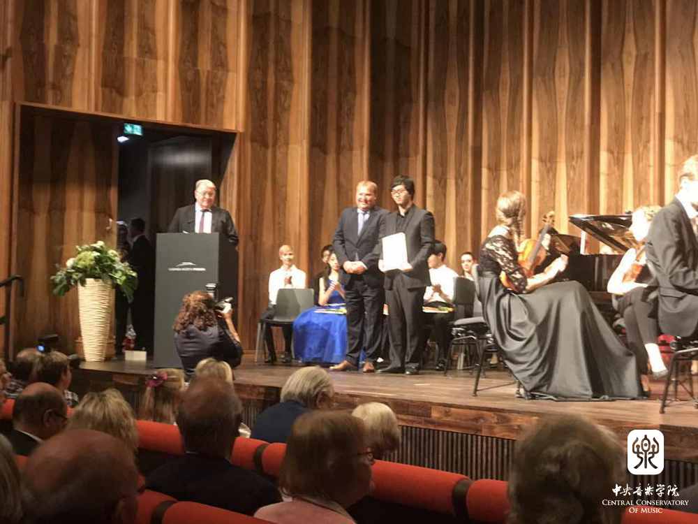 附中学生罗超文在颁奖音乐会上领奖 |