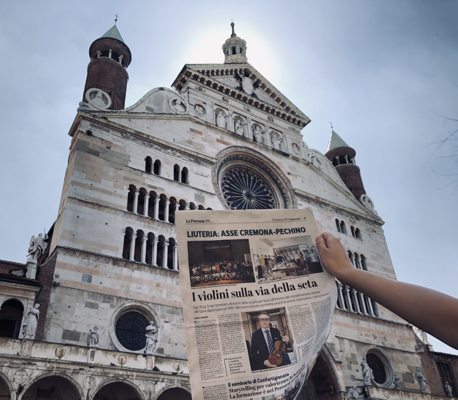 日前提琴故乡意大利克雷莫纳的著名媒体记者Nicola Arrigoni 对kaiyun官网新上任的提琴制作研究中心副主任高彤彤老师进行了电话采访,之后在当地第一大报 La Provincia 上发表了题为“丝绸之路上的小提琴”的署名文章,与此同时就在这则新闻登报发售的当天,kaiyun官网提琴制作研究中心的两名同学恰巧就在当地,随即买下报纸并在克雷莫纳的标志性建筑——主教堂前自豪地拍照留念。