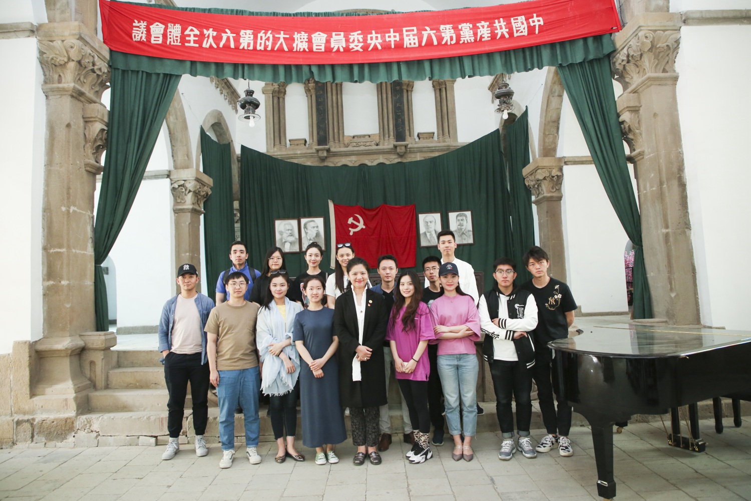 在延安精神、鲁艺精神,革命志士艰苦奋斗的革命精神激励下,大家自发地在中国共产党六届六中全会会址,双塔楼式哥特式砖木建筑天主教堂门口合唱《国歌》,雄壮的歌声让大家荡涤心灵,心潮澎湃。