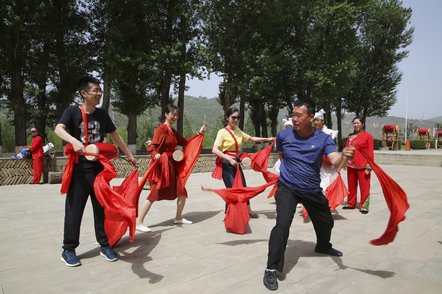 乐团一行兴致勃勃地现场学习安塞腰鼓