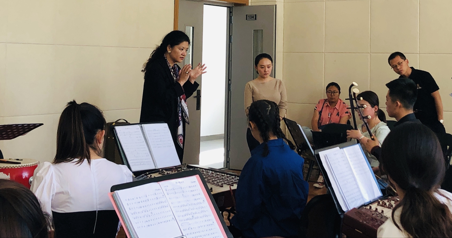 乐团指挥陈冰老师为鲁迅艺术学院的民乐团现场排练《彩云追月》等乐曲,并针对民乐团的曲目安排、排练情况、具体演奏技巧以及音乐表现力等等问题都进行了详尽的指导