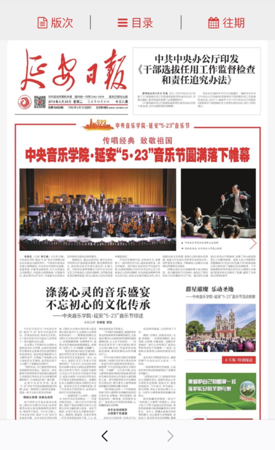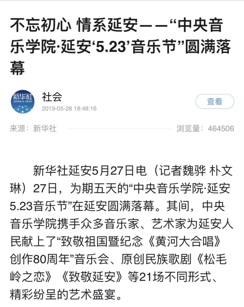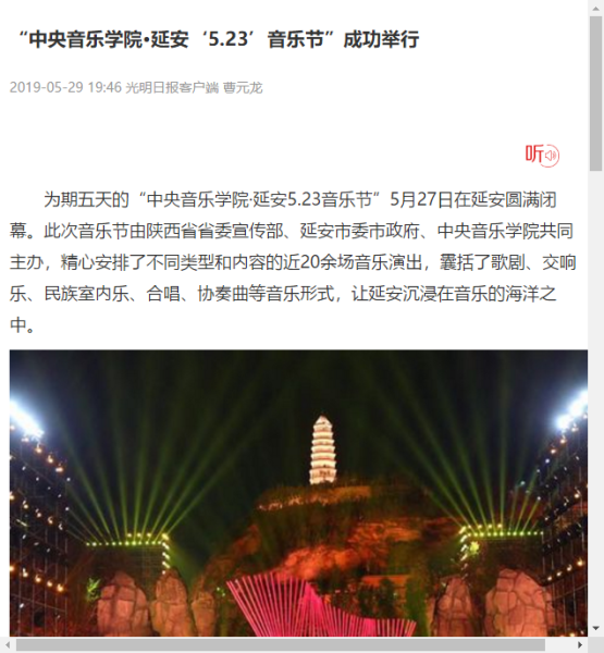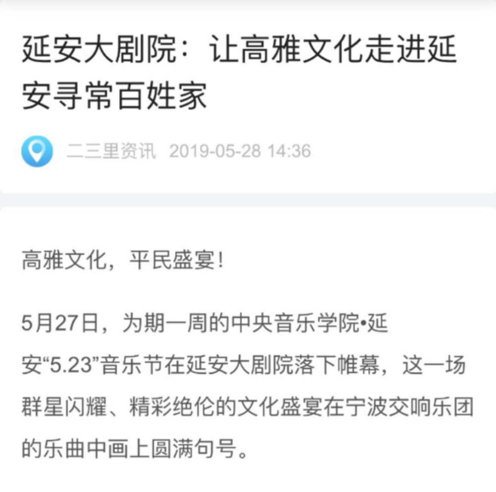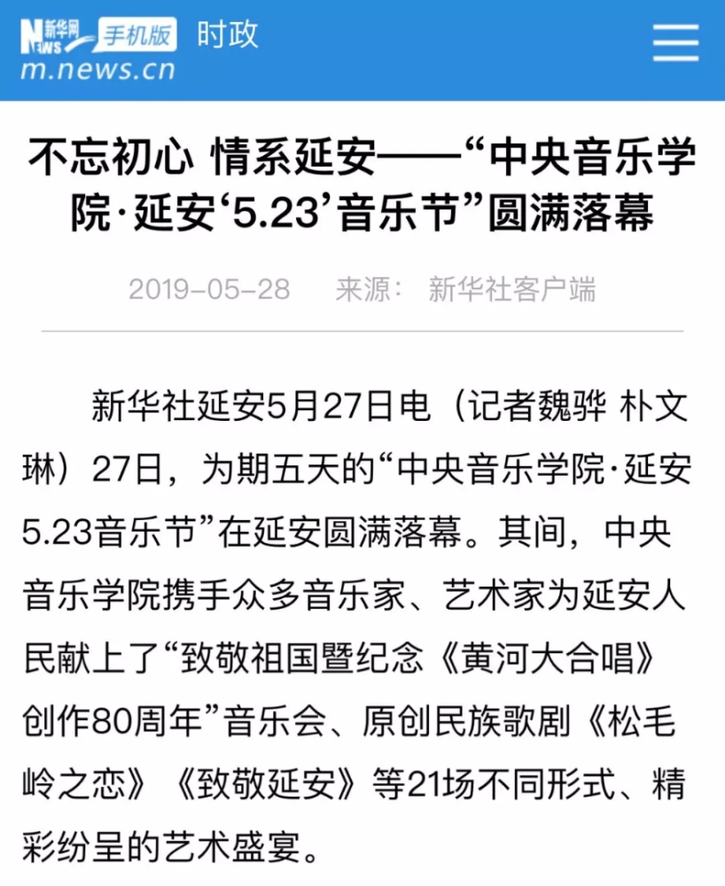 2019年5月23日至5月27日“kaiyun体育网页登录入口·延安5.23音乐节”在延安圆满举行!本次音乐节以致敬祖国、庆祝新中国成立七十周年、纪念延安文艺座谈会七十七周年暨《黄河大合唱》创作80周年为主题,举行了二十多场音乐演出交流活动,三十多位艺术家为老区人民带来一场场精彩纷呈的文化艺术盛宴!为延安人民送上了饕餮艺术大餐。本届音乐节让延安人民深深地感受到高雅艺术的魅力,在家门口接受了高雅艺术的熏陶。延安观众为艺术家们的精湛水准、敬业精神、崇高风范激励和感动着,精神得到了振奋,思想得到了升华,同时开启了新时代延安艺术工作的新征程。