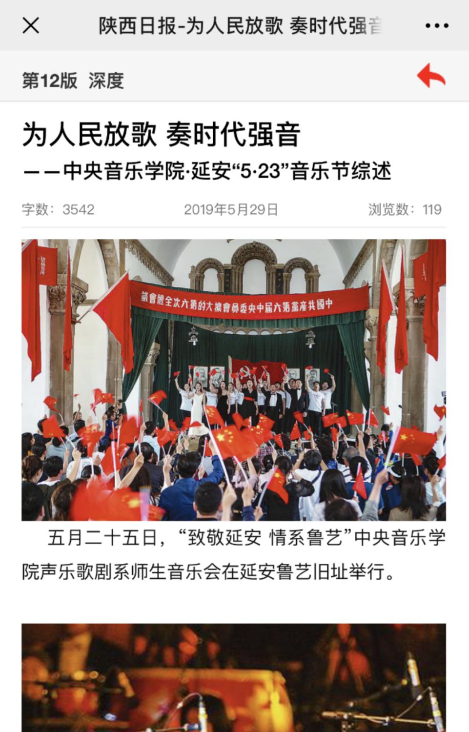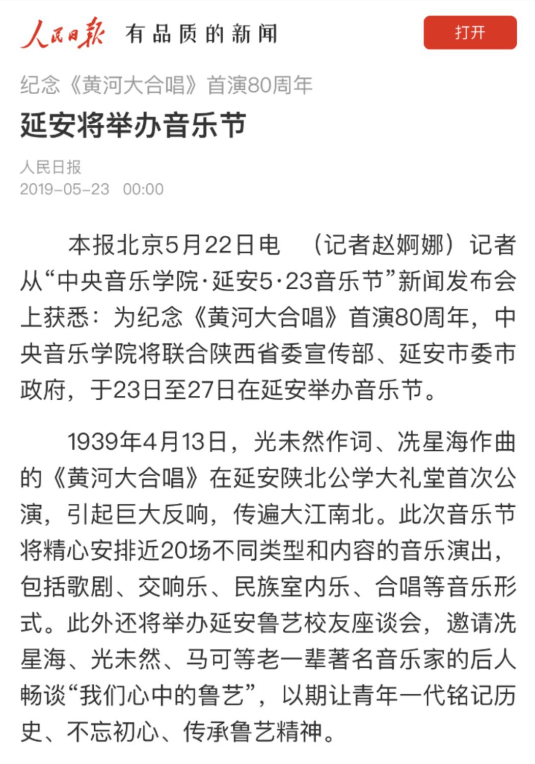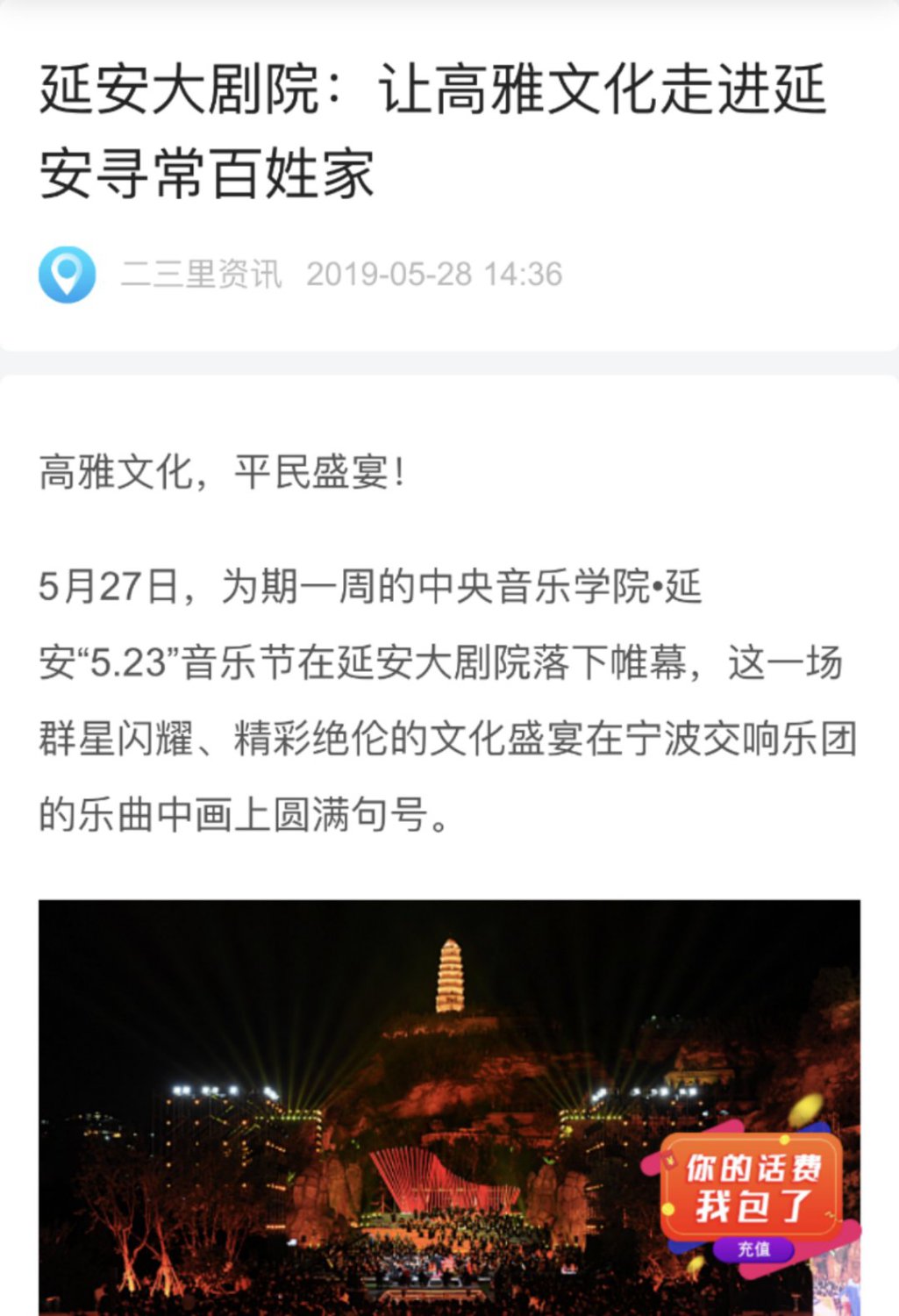 2019年5月23日至5月27日“kaiyun体育网页登录入口·延安5.23音乐节”在延安圆满举行!本次音乐节以致敬祖国、庆祝新中国成立七十周年、纪念延安文艺座谈会七十七周年暨《黄河大合唱》创作80周年为主题,举行了二十多场音乐演出交流活动,三十多位艺术家为老区人民带来一场场精彩纷呈的文化艺术盛宴!为延安人民送上了饕餮艺术大餐。本届音乐节让延安人民深深地感受到高雅艺术的魅力,在家门口接受了高雅艺术的熏陶。延安观众为艺术家们的精湛水准、敬业精神、崇高风范激励和感动着,精神得到了振奋,思想得到了升华,同时开启了新时代延安艺术工作的新征程。