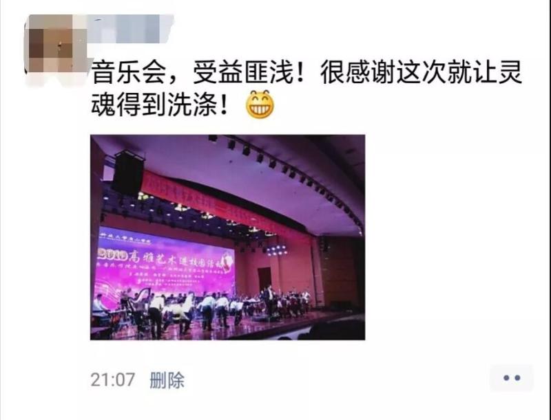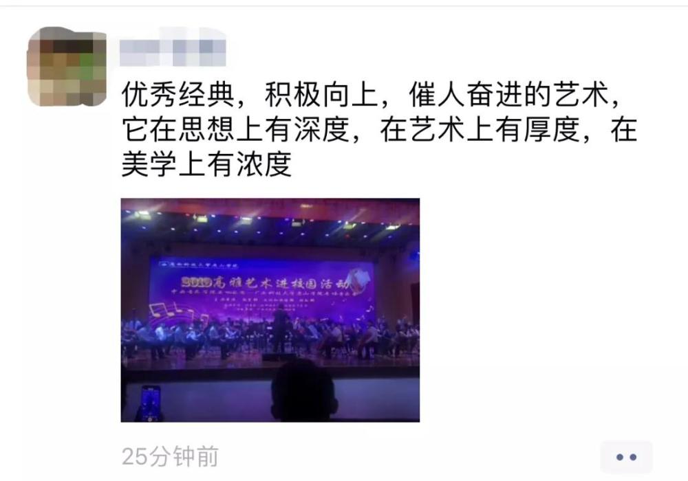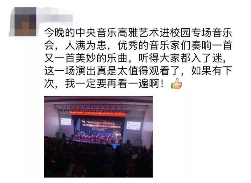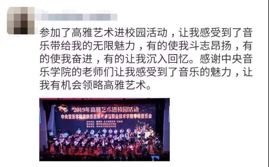 此次广西巡演大获成功,在广大师生中掀起高雅艺术热潮,引领学生树立正确的审美观念,构建精神家园,提升文化自觉,增强文化自信。唯有如此,才能为国家、为社会、为人民培养出有道德情操、有理想抱负的具有中国特色的社会主义合格人才。