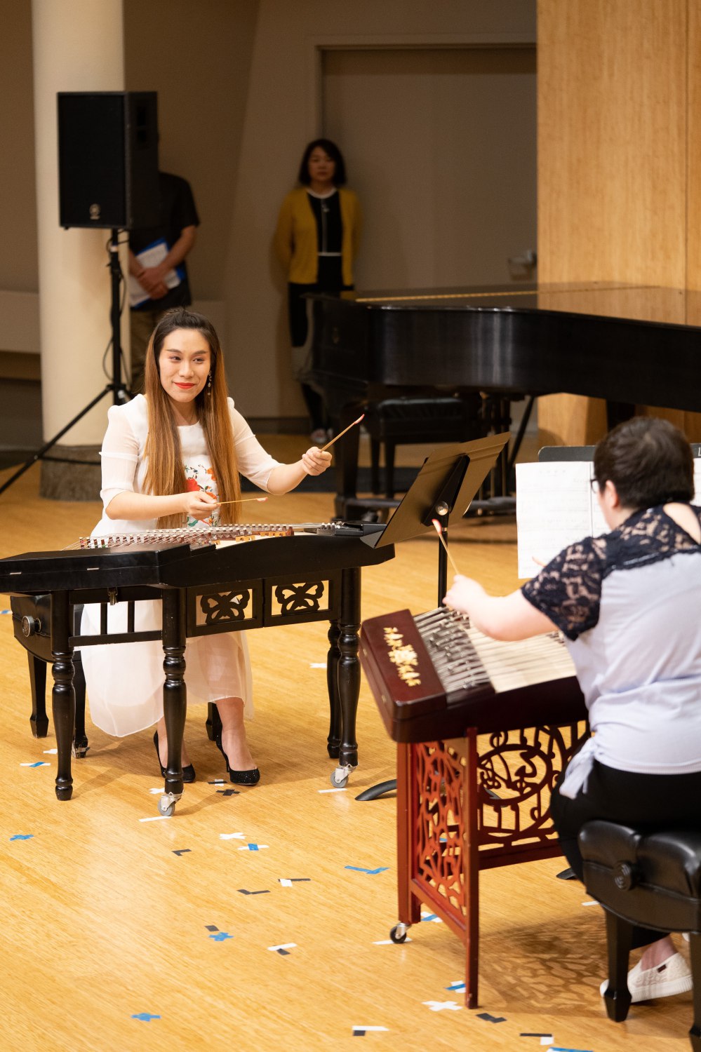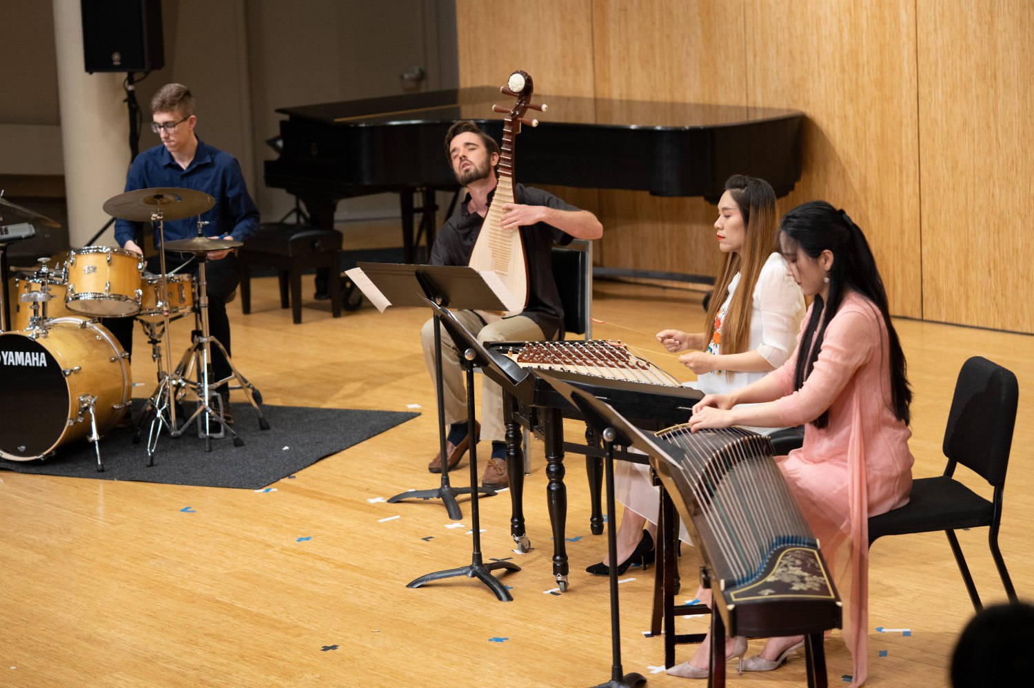 波州大音乐学院学生Amanda Chan与波州大孔子学院音乐教师鲁静演奏了经典扬琴二重奏作品《平湖秋月》;另一位曾两次参加“中国音乐文化暑期国际研修学院”的学员——波州大音乐学院毕业生Damon Flick以中国音乐为元素创作了作品《念》,用琵琶、架子鼓、扬琴和古筝的中西乐器组合形式表达思乡之情。