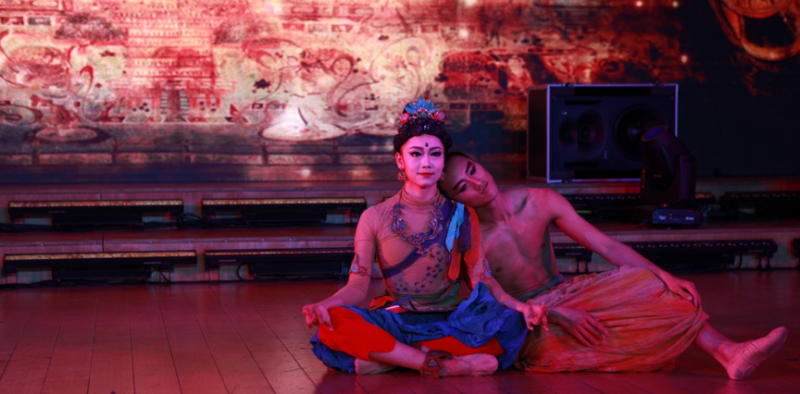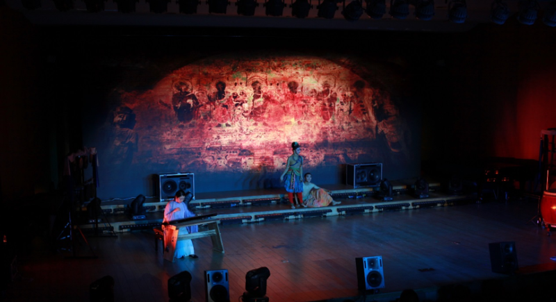 第七首《一叶菩提》也是青年作曲家关鹏创作,菩提一叶却包容万象,二胡一把却独具意境,舞者一人旋转跳跃间却将西魏壁画上的飞天羽人形象诠释得淋漓尽致,双臂双脚奋力伸展,在大千宇宙的怀抱中尽显阳刚,以形传神,道不出具体的韵味。二胡与舞者刚柔并济,电子音乐与若隐若现的壁画背景为二者创造出万物共生的空间感,流露出中国传统文化的智慧与内涵。