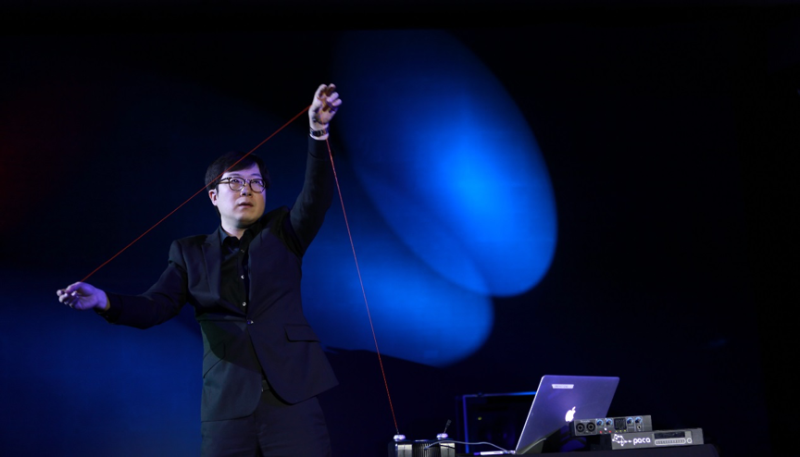 第三首《绳索与声腔》是由青年电子音乐作曲家冯金硕创作,这部作品是互动式电子音乐,现场中作曲家利用手中的绳索进行创作,在作曲家的掌控与运用下,绳索通过KYMA系统的变形成为了人声,这种新颖的“歌唱”方式创造出了夸张化的艺术效果,这不仅是演出形式上的拓展,更是科技带给艺术的创新思维。