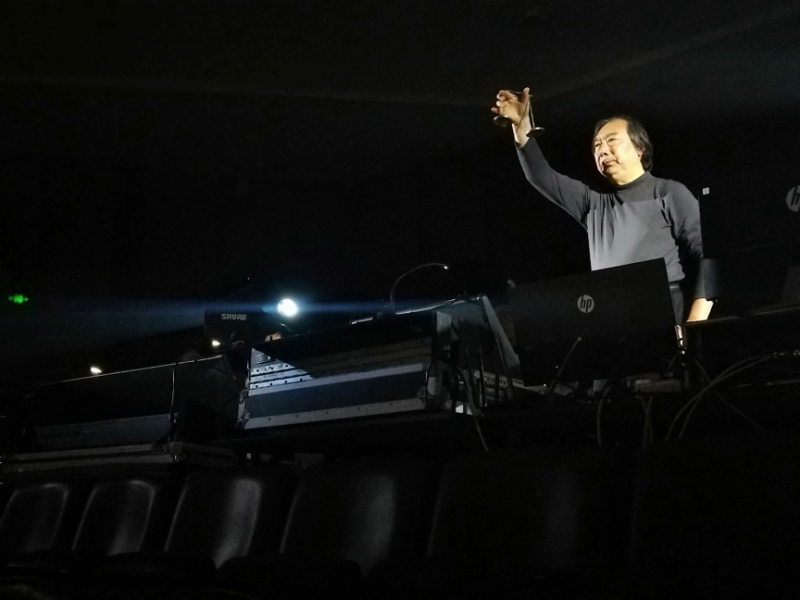 最后一首《诺日朗》是张小夫教授的代表作品,这部作品可谓本场演出画龙点睛之作,整部作品在全新的演绎下,将哲学与佛教、电子与器乐、传统与现代结合的天衣无缝,作曲家张小夫将“转经”和“轮回”这两个概念转化、提炼为作品当中一种独特的、个性化的电子音乐表达语汇,就像是循环式的音响动机。在数字影像的烘托下,共同营造出神秘深邃的音乐语境和人神对话的“虚拟空间”。这一场穿越时空,跨越界限的对话,让现场观众再一次感受到电子音乐带来的无限震撼。