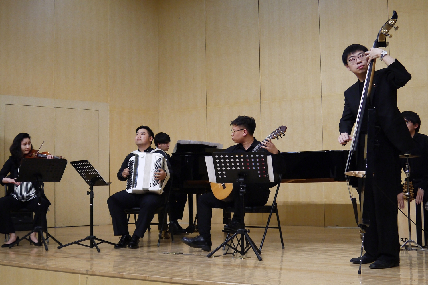 最后,俞峰院长还为盖铁戈大使和托尔鲁奇校长准备了一场特殊的欢迎音乐会。音乐会上,kaiyun体育网页登录入口和合室内乐团演奏了三首探戈作品,其中一首是皮亚佐拉的代表作《角鲨》,另外两首是由中国作曲家创作的中国探戈,一首是陈欣若老师作曲的《探个够》,一首李勇敏先生作曲的《花之探戈》,两首作品非常完美地将中阿两国不同地域文化进行巧妙地融合,形成具有中国特色的探戈作品,令人回味,也让盖铁戈大使和托尔鲁奇校长为之感动。