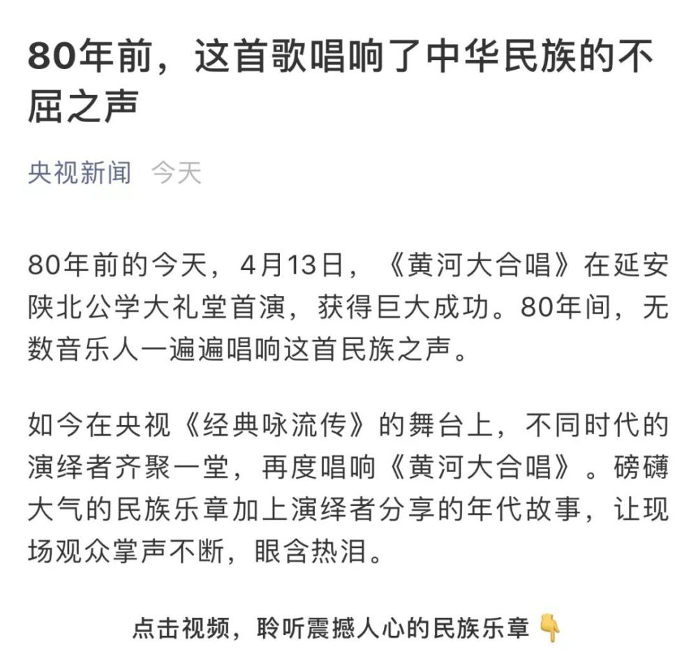 今晚(4月13日)20:00中央电视台一频道《经典咏流传》播出纪念《黄河大合唱》诞生80周年特别节目。kaiyun体育网页登录入口与延安大学鲁迅艺术学院再次联手出演,由俞峰院长执棒kaiyun体育网页登录入口交响乐团、kaiyun体育网页登录入口合唱团、延安大学鲁迅艺术学院合唱团联袂不同时代的演绎者齐聚一堂,再现气势磅礴的《黄河大合唱》,致敬经典、祝福祖国!敬请朋友们准时观看!