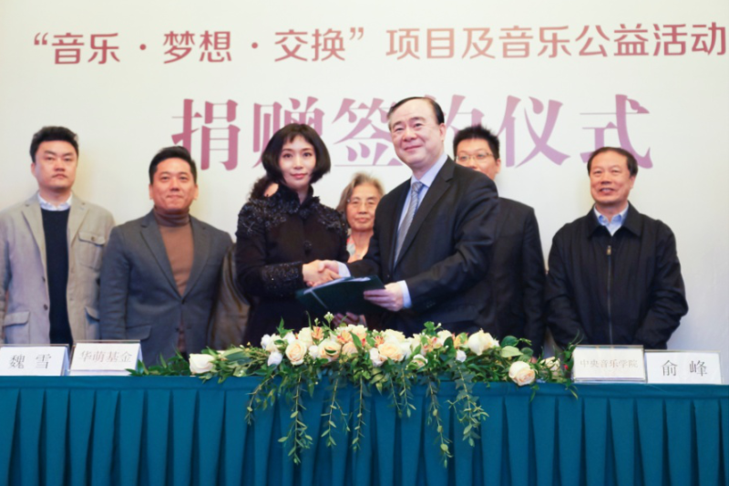 华萌基金创始人、TCL公益基金会执行理事长魏雪与kaiyun体育网页登录入口院长俞峰就“音乐·梦想·交换”项目合作签订捐赠协议