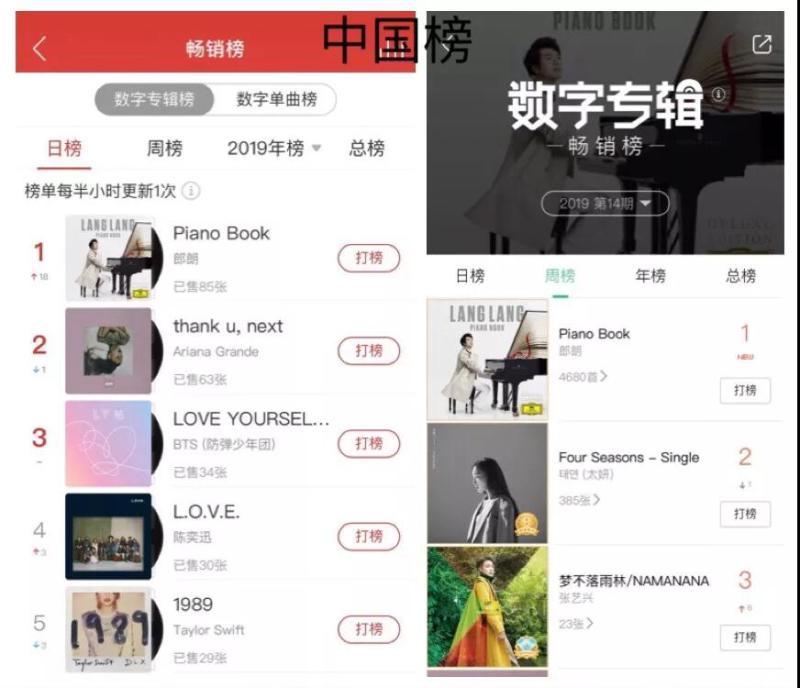 世界顶尖钢琴家郎朗2019年全新专辑《钢琴书》3月29日全球发行。郎朗介绍:“新专辑《钢琴书》很容易听懂,可以说接受门槛为零,不管你是什么年龄,从事什么行业,拥有什么背景,我敢保证你都能听懂。”这一点从榜单成绩可见一斑:发行不到10天,新专辑《钢琴书》就打入iTunes全球流行榜top10。