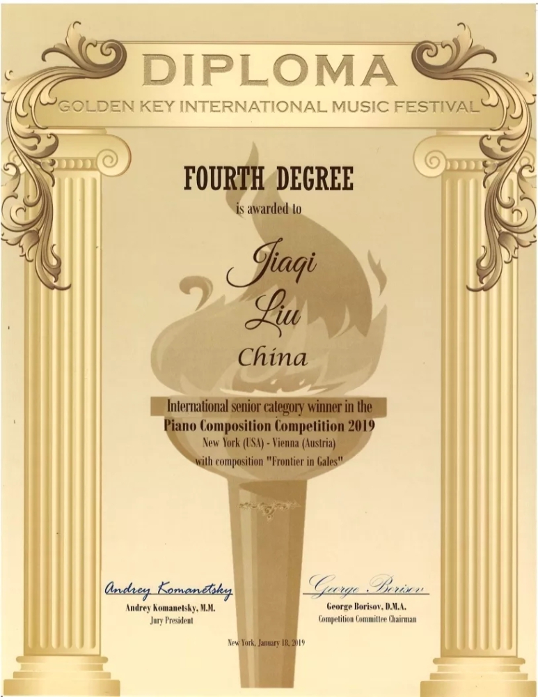 与此同时,这首作品还获得了2019美国金钥匙音乐节钢琴作曲比赛 ( Golden Key Music Festival Piano Composition Competition) 国际高级组四等奖。受组委会邀请,刘佳骐将于今年八月前往奥地利参加金钥匙音乐节“世界作曲家音乐会”( World Composers’Concert),在维也纳Ehrbar音乐厅亲自演奏获奖作品。