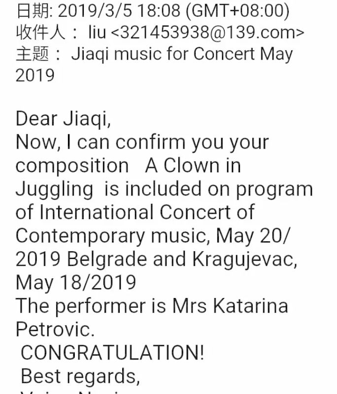 2019年3月,刘佳骐的另一首钢琴作品A Clown in Juggling(耍杂技的小丑)最终入选塞尔维亚国际当代音乐会节目单作品征集 (Call for Scores for Program of International Concert of Contemporary Music),获得第三名。塞尔维亚国际当代音乐会将于2019年5月18日和5月20日分别在贝尔格莱德艺术中心和克拉古耶瓦茨国家博物馆举行,由塞尔维亚钢琴家卡塔琳娜·彼德罗维奇演奏入选作品。本次征集活动面向全球作曲者,无年龄限制,旨在为12岁以下儿童和12至20岁青少年学生征集适合他们演奏的作品,帮助他们建立正确和积极的生活观念,健康成长。 A Clown in Juggling完成于2017年10月,参加为12至20岁青少年学生而作的征集。作品通过描写舞台上的小丑不畏艰辛,勇敢而幽默的表演情景,表现了其热爱生活、热爱劳动、乐于奉献,向往和追求美好未来的积极精神。