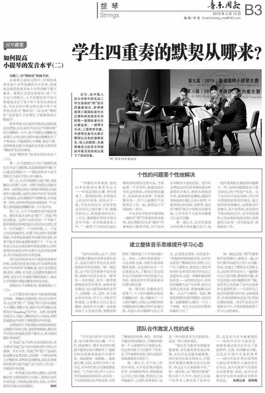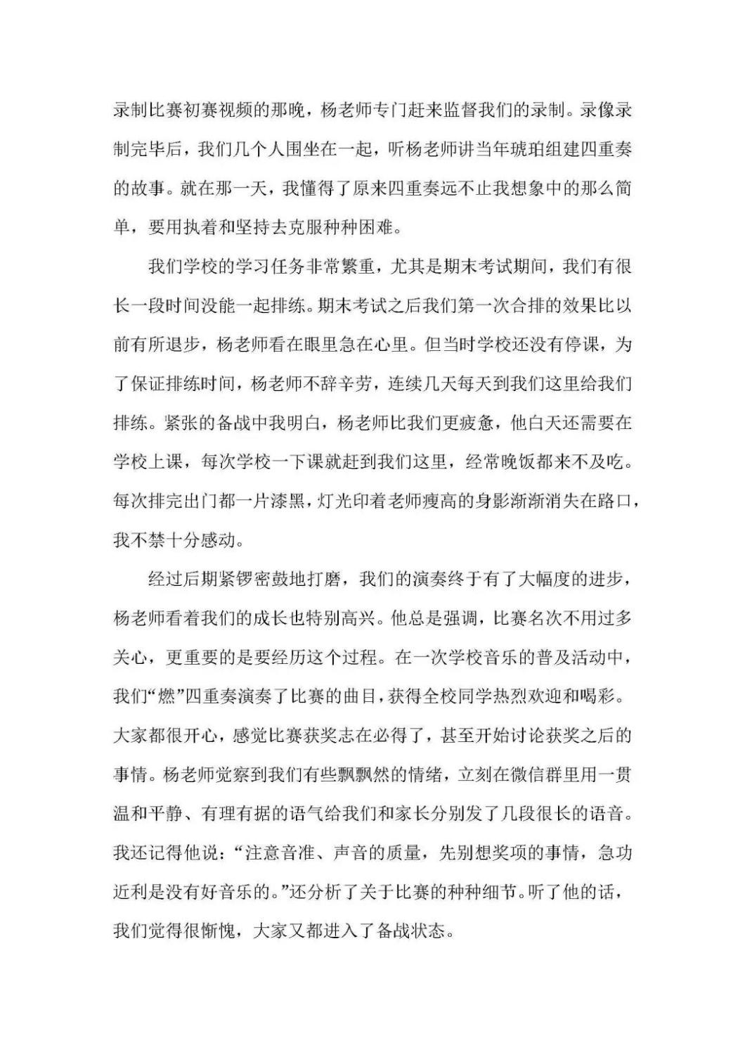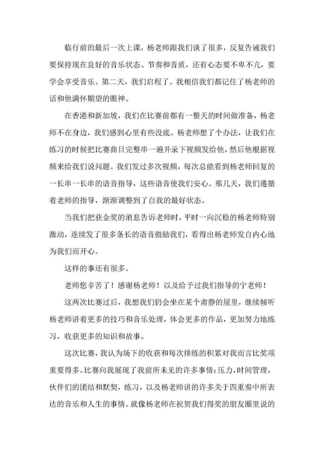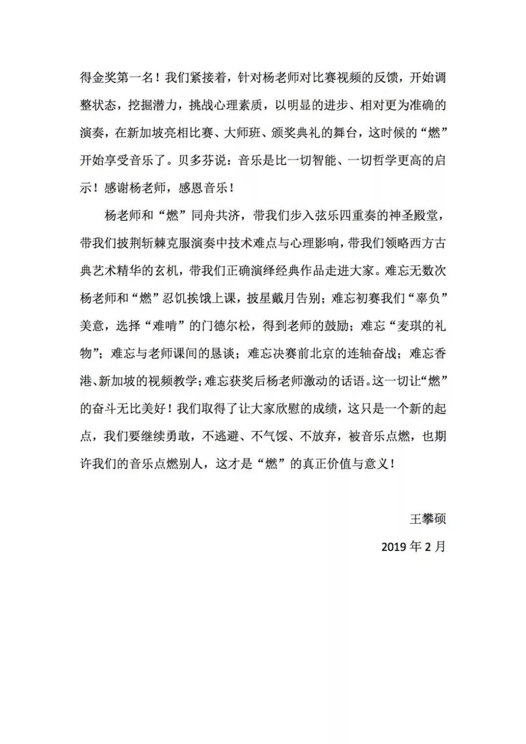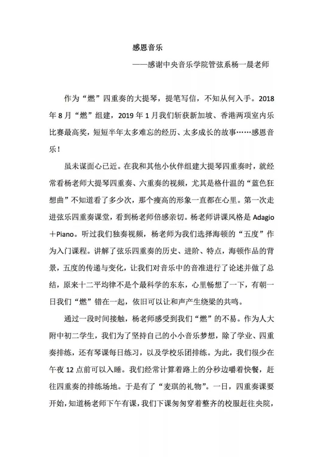 近期,kaiyun官网管弦系收到了来自中国人民大学附中四位同学的感谢信,其中记载了他们与kaiyun官网杨一晨老师学习弦乐四重奏的收获与感激之情。通过感谢信笔者了解到,这四位同学目前就读于人大附中初中二年级,品学兼优。2018年时,他们曾听过kaiyun官网室内乐团—“琥珀四重奏”的公益音乐会,在音乐会后同学们热爱上了室内乐艺术,表达了组建弦乐四重奏愿望,后追随杨一晨老师学习。经历了半年的时间,同学们从零起步,在作品选择与训练等方面体验了接近专业化的学习状态。在2019年2月,“燃四重奏”以绝对优势获得香港国际室内乐比赛15岁以下爱乐组金奖。又获得了2019新加坡音乐比赛爱乐组金奖。