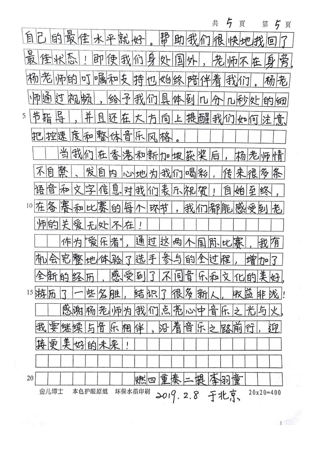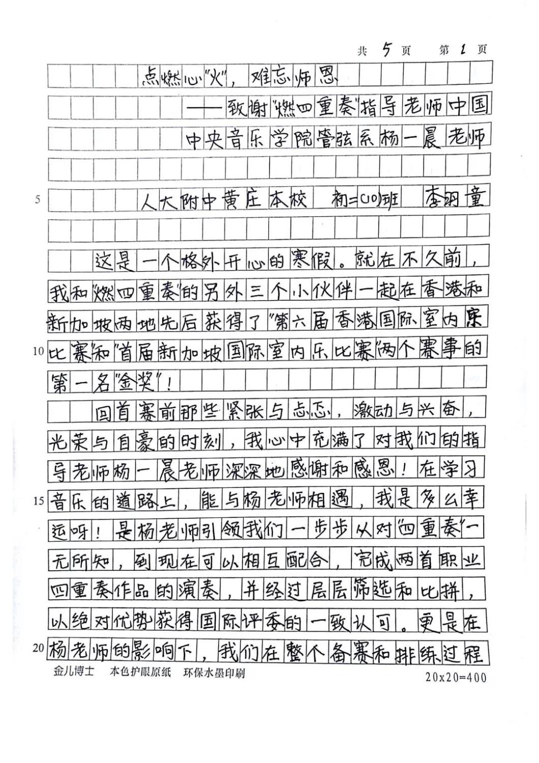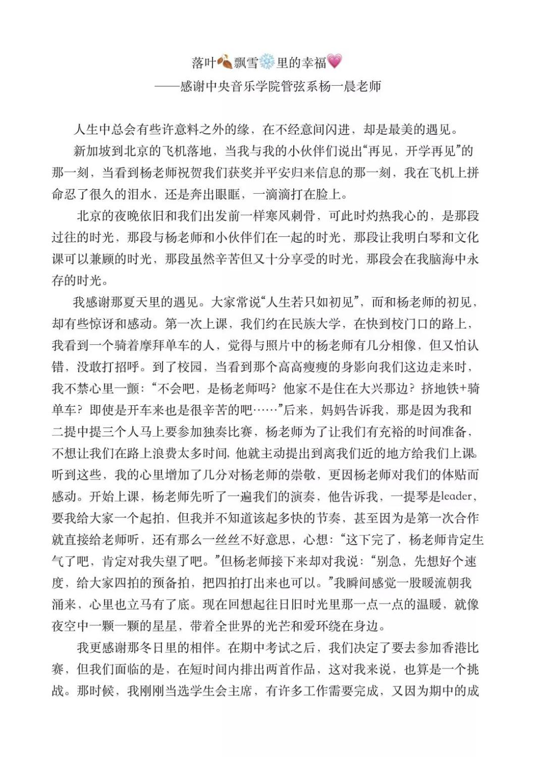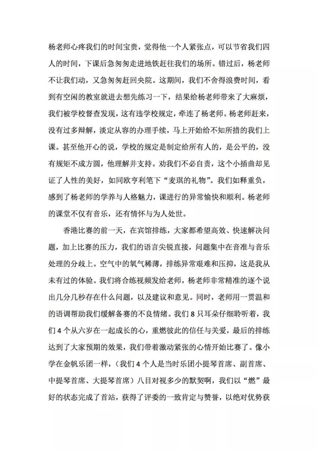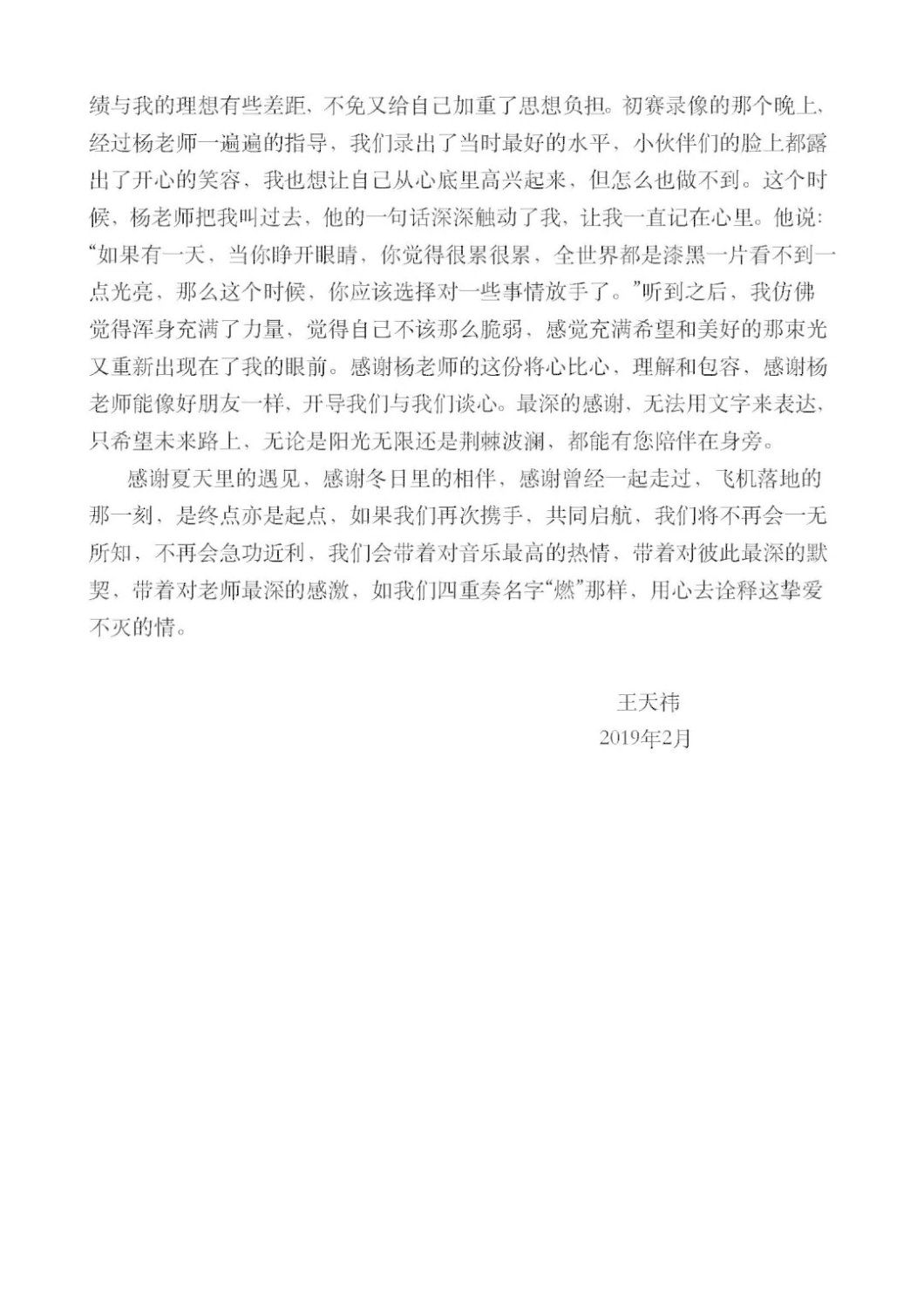 近期,kaiyun官网管弦系收到了来自中国人民大学附中四位同学的感谢信,其中记载了他们与kaiyun官网杨一晨老师学习弦乐四重奏的收获与感激之情。通过感谢信笔者了解到,这四位同学目前就读于人大附中初中二年级,品学兼优。2018年时,他们曾听过kaiyun官网室内乐团—“琥珀四重奏”的公益音乐会,在音乐会后同学们热爱上了室内乐艺术,表达了组建弦乐四重奏愿望,后追随杨一晨老师学习。经历了半年的时间,同学们从零起步,在作品选择与训练等方面体验了接近专业化的学习状态。在2019年2月,“燃四重奏”以绝对优势获得香港国际室内乐比赛15岁以下爱乐组金奖。又获得了2019新加坡音乐比赛爱乐组金奖。