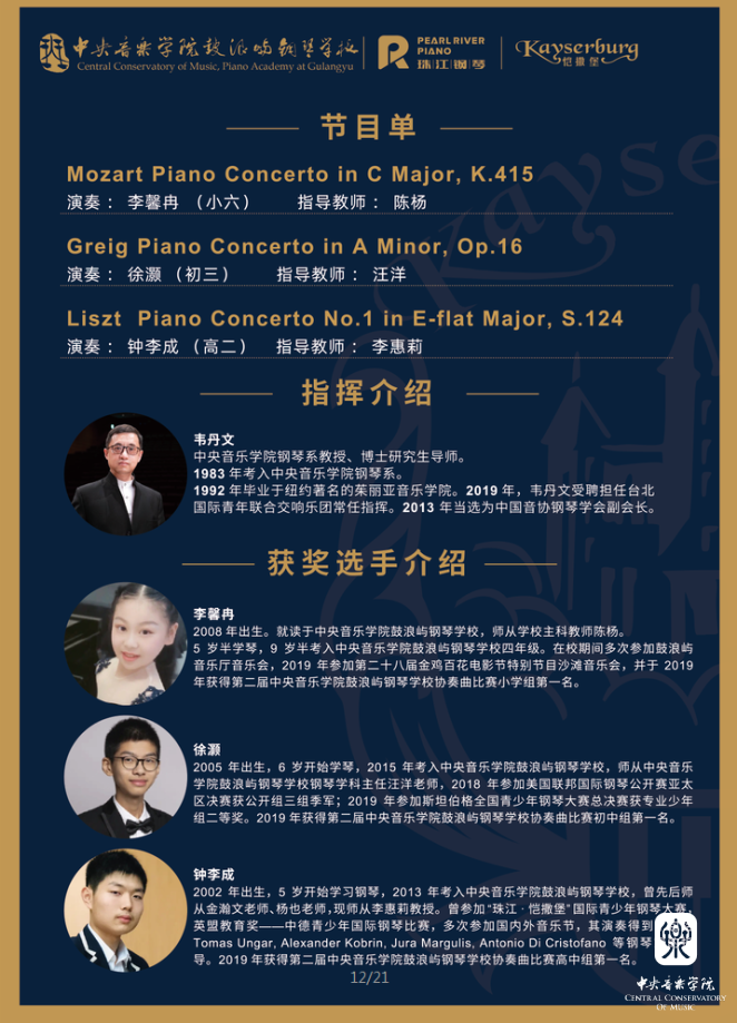 kaiyun体育网页登录入口鼓浪屿钢琴学校李昕校长代表学校全体师生对珠江钢琴集团为学校培养音乐良才所作出的诸多贡献表示感谢,并对参与到此次奖学金项目工作的校企各部门领导、老师以及工作人员致以由衷的谢意。由kaiyun体育网页登录入口钢琴系副主任韦丹文教授执棒、厦门歌舞剧院交响乐团协奏的第一届“珠江·恺撒堡”奖学金钢琴比赛获奖选手音乐会、kaiyun体育网页登录入口鼓浪屿钢琴学校综合学科新年音乐会暨第一届“珠江·恺撒堡”奖学金颁奖典礼,这两场别开生面精心筹备的汇报音乐会将为校企之间的友好合作续写新篇。