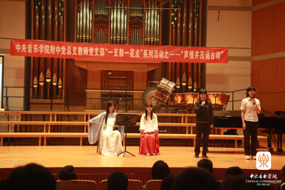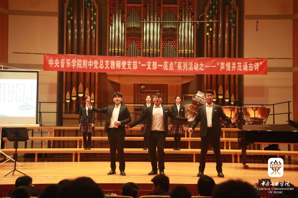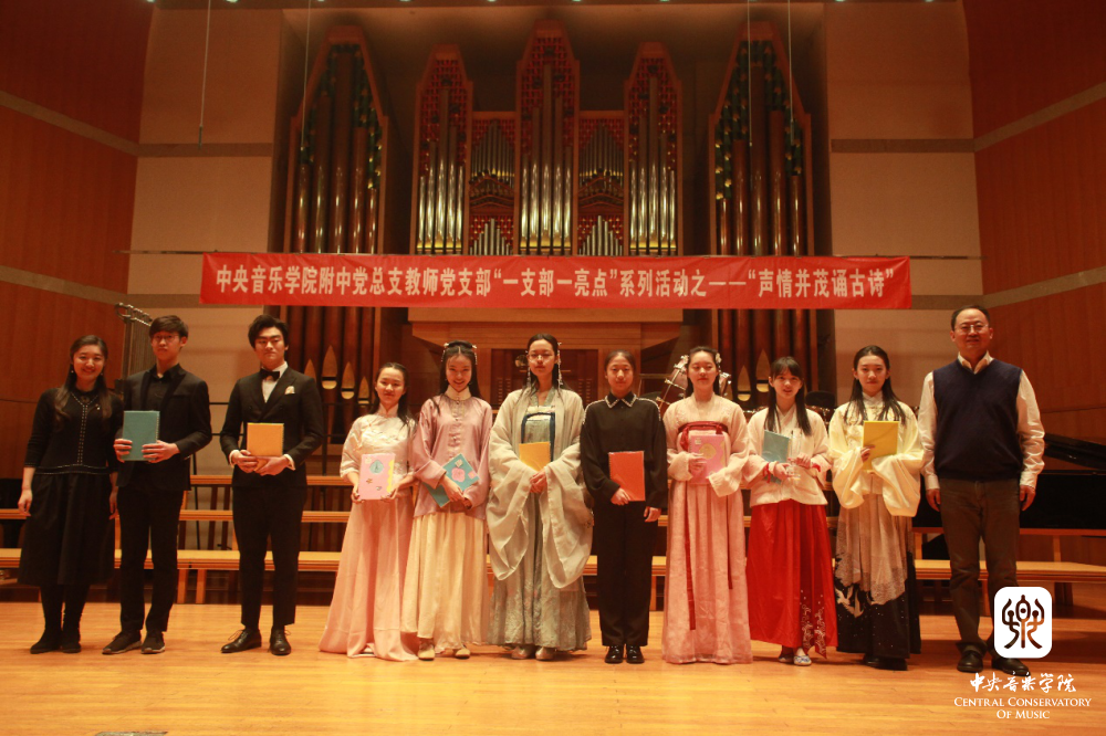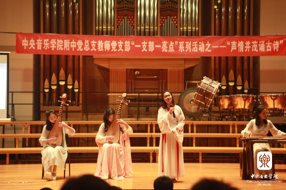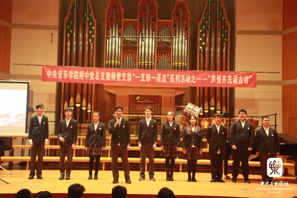 “声情并茂诵古诗” 是附中党总支教师党支部在“党建带团建”工作思路指导下的一次创新实践,也是支部结合自身特点,积极打造“一支部一亮点、一党员一旗帜”的系列活动之一。它力求发挥附中学生的音乐专长,以“和诗咏歌”的形式,给音乐赋予诗词能量,延续经典的生命力,通过诵唱让学生在潜移默化中接受诗词的熏陶,产生对美好生活的期待,对古典文化怀揣敬畏,感受中华文化的博大精深,从而更加热爱祖国和民族文化,最终在实践中探索符合音乐院校特色的传统文化教学模式。这些不同于知识灌输式的创新形式是学生喜闻乐见的——亘古绵延的“古老”知识,与富有巧思的“年轻”形式交相辉映、相得益彰。